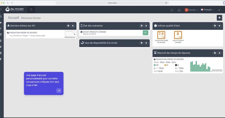 2Be-FFICIENT est un outil de monitoring de l’expérience utilisateur qui permet d’analyser en profondeur les performances des sites web. Grâce à une interface conviviale, il offre des tableaux de bord personnalisables et des rapports en temps réel pour améliorer la qualité de l’expérience utilisateur. Cet outil est idéal pour les responsables marketing, les développeurs web, et les chefs de projet souhaitant optimiser l’efficacité de leurs plateformes.