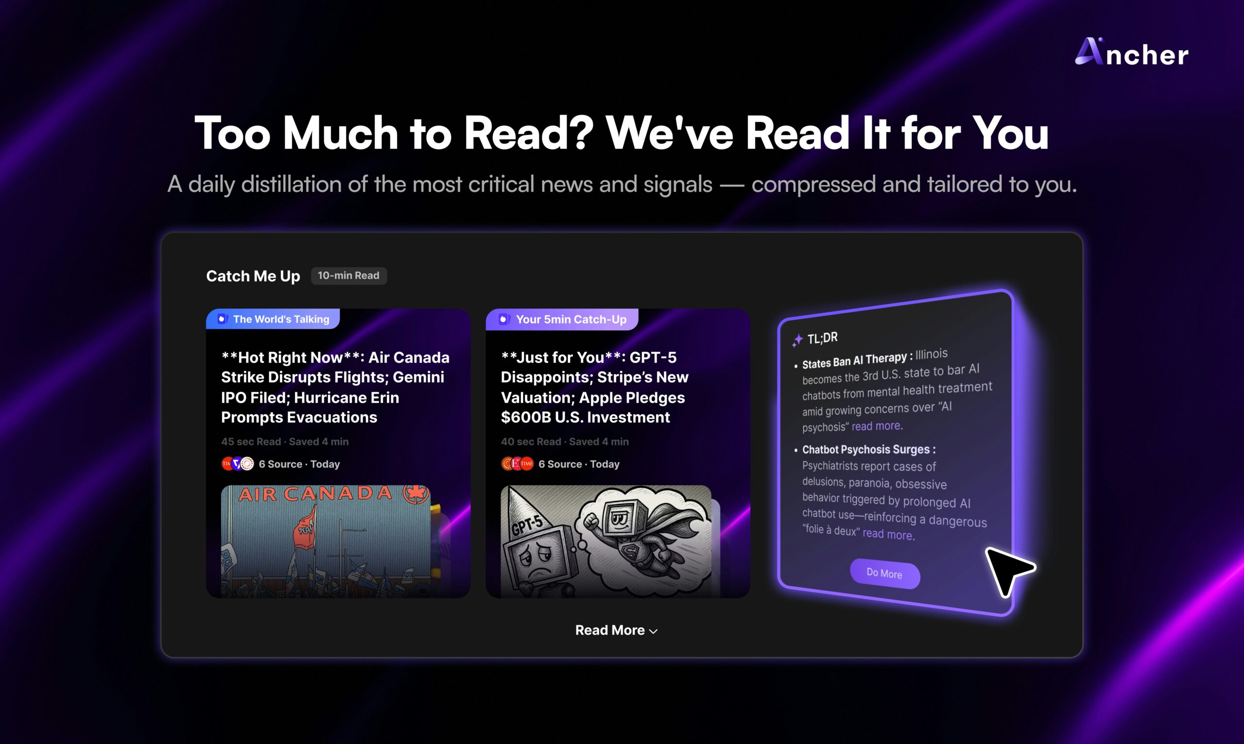 Ancher est un outil qui agit comme votre chef de cabinet pour vous aider à rester concentré sur ce qui compte vraiment. Plutôt que de vous noyer dans le flux d’informations futiles, Ancher filtre le bruit, apprend vos besoins et vous fournit des insights pertinents. Grâce au Mode Do, explorez les différentes perspectives sur un sujet, voyez comment les autres réagissent, et transformez des articles en publications personnelles. Ancher reste vigilant pour vous alerter lorsque des percées significatives se produisent.