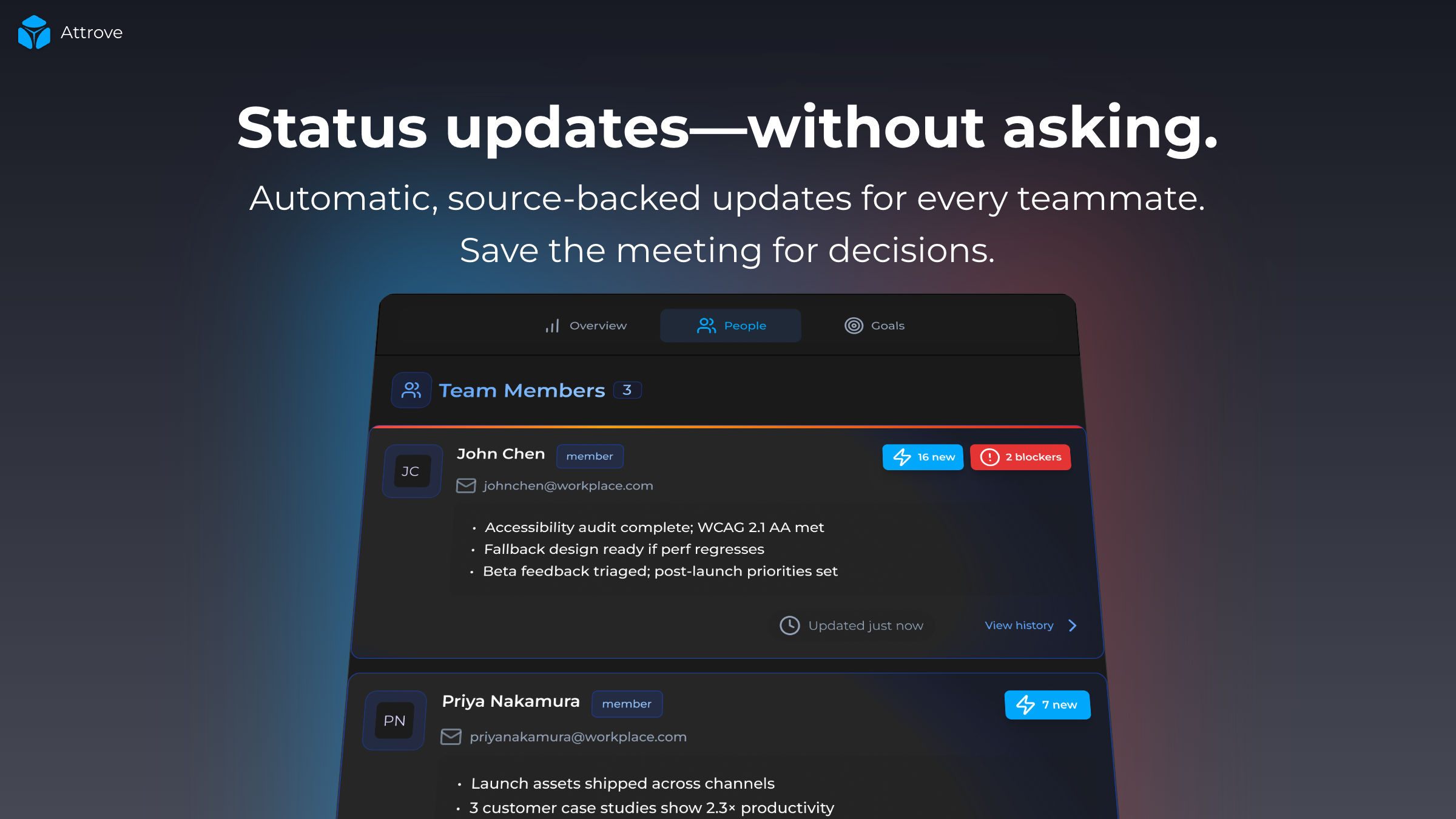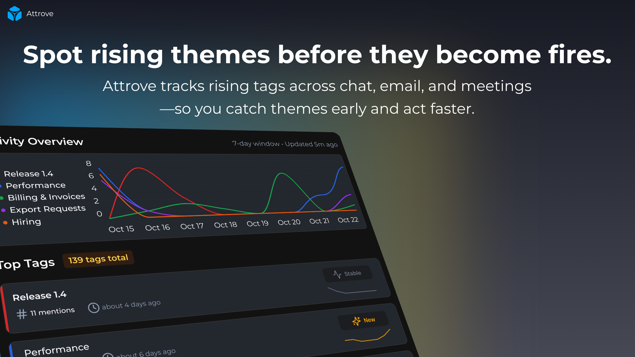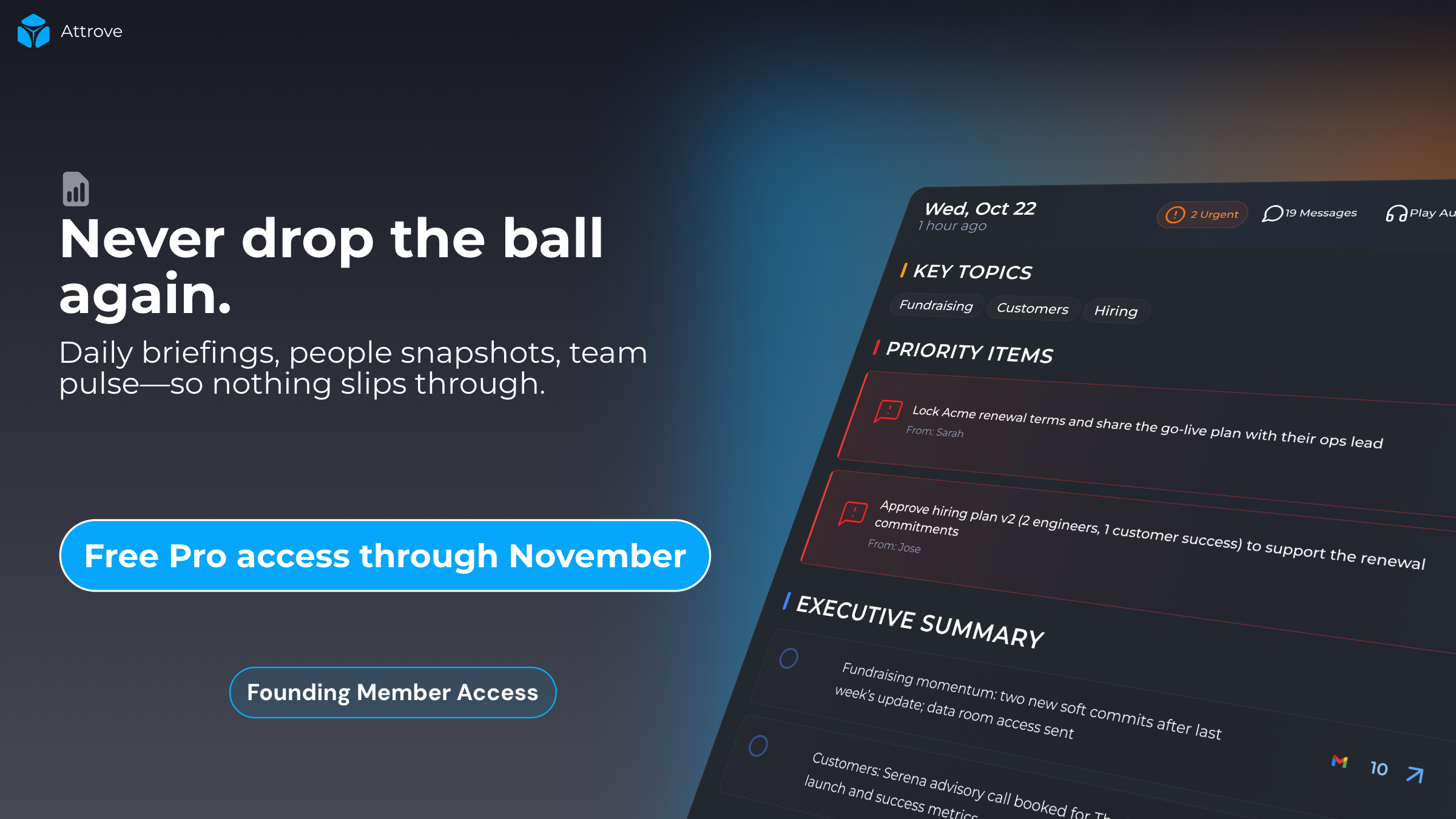 Attrove AI vous aide à rester au courant de tout ce qui se passe dans votre environnement de travail, y compris Slack, les emails et les réunions. Il surveille votre espace de travail et met en avant ce qui nécessite réellement votre attention avant que cela ne devienne urgent. Vous recevez des résumés quotidiens, vous suivez les sujets émergents et vous évitez de laisser tomber des tâches importantes. Votre espace de travail est géré en mode autonome.