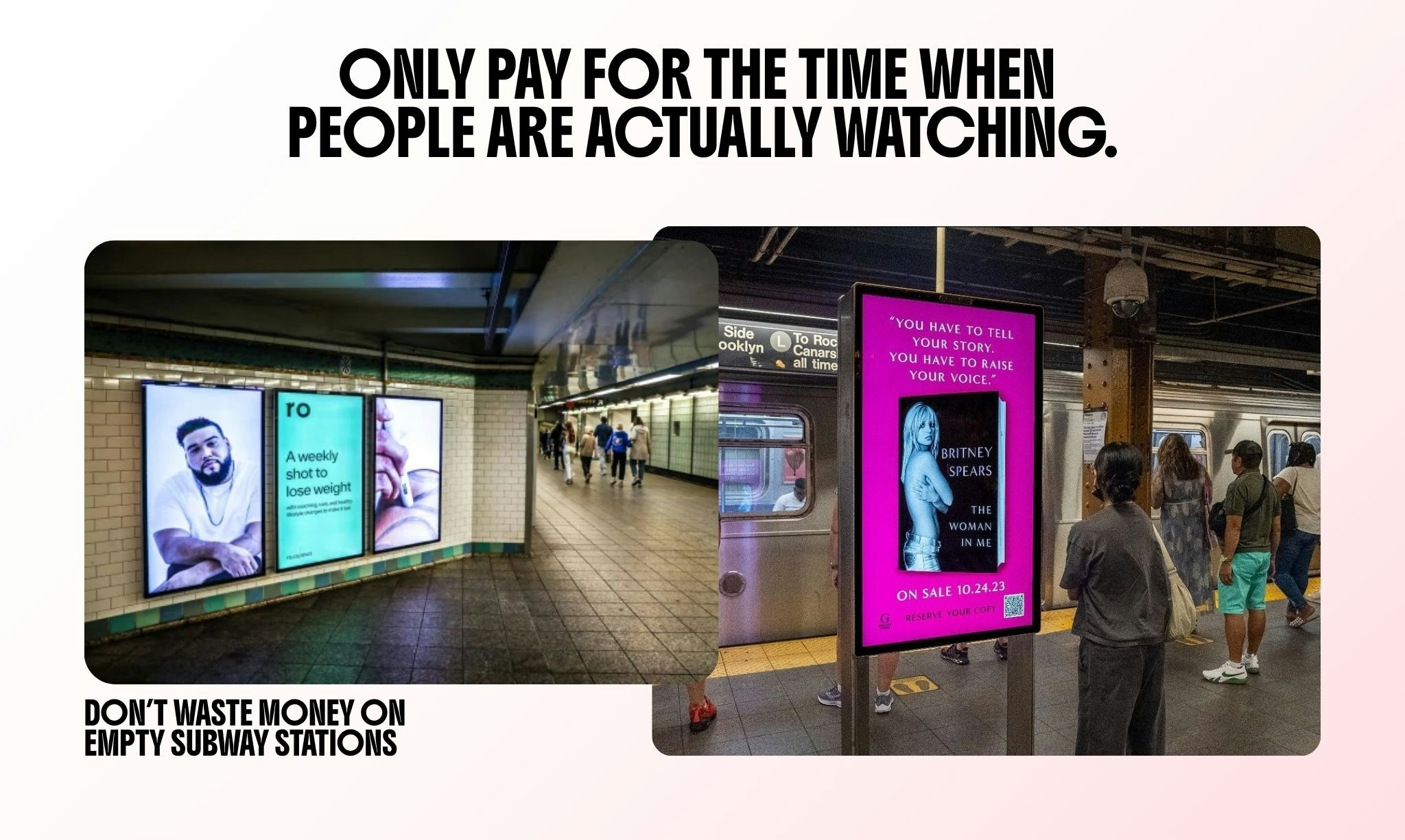 - Blindspot vous permet de réserver des panneaux d’affichage comme vous réservez une course Uber. Imaginez vos publicités à Times Square ou ailleurs dans le monde. Vous choisissez les panneaux exacts que vous voulez, les horaires nécessaires, et votre création est adaptée en temps réel en fonction de la météo, du trafic ou de l’affluence.