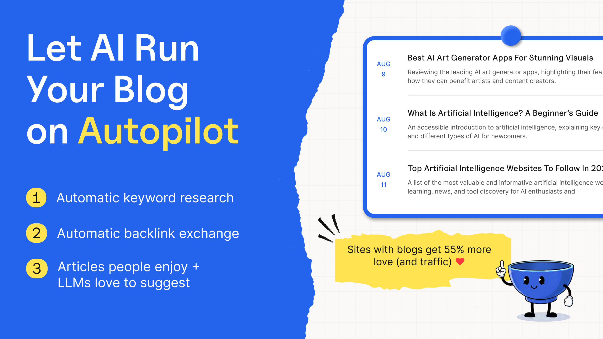 - BlogBowl automatise votre blog avec des articles SEO principalement alimentés par IA qui sont écrits de manière à imiter un humain. Il génère des articles complets avec des images, des vidéos, des statistiques et des citations, le tout optimisé pour les algorithmes de Google et d’IA comme ChatGPT et Claude. BlogBowl utilise un noyau open source et offre des outils d’analyse et de newsletters, facilitant l’acquisition de clients grâce à un contenu de qualité publié sur votre site.