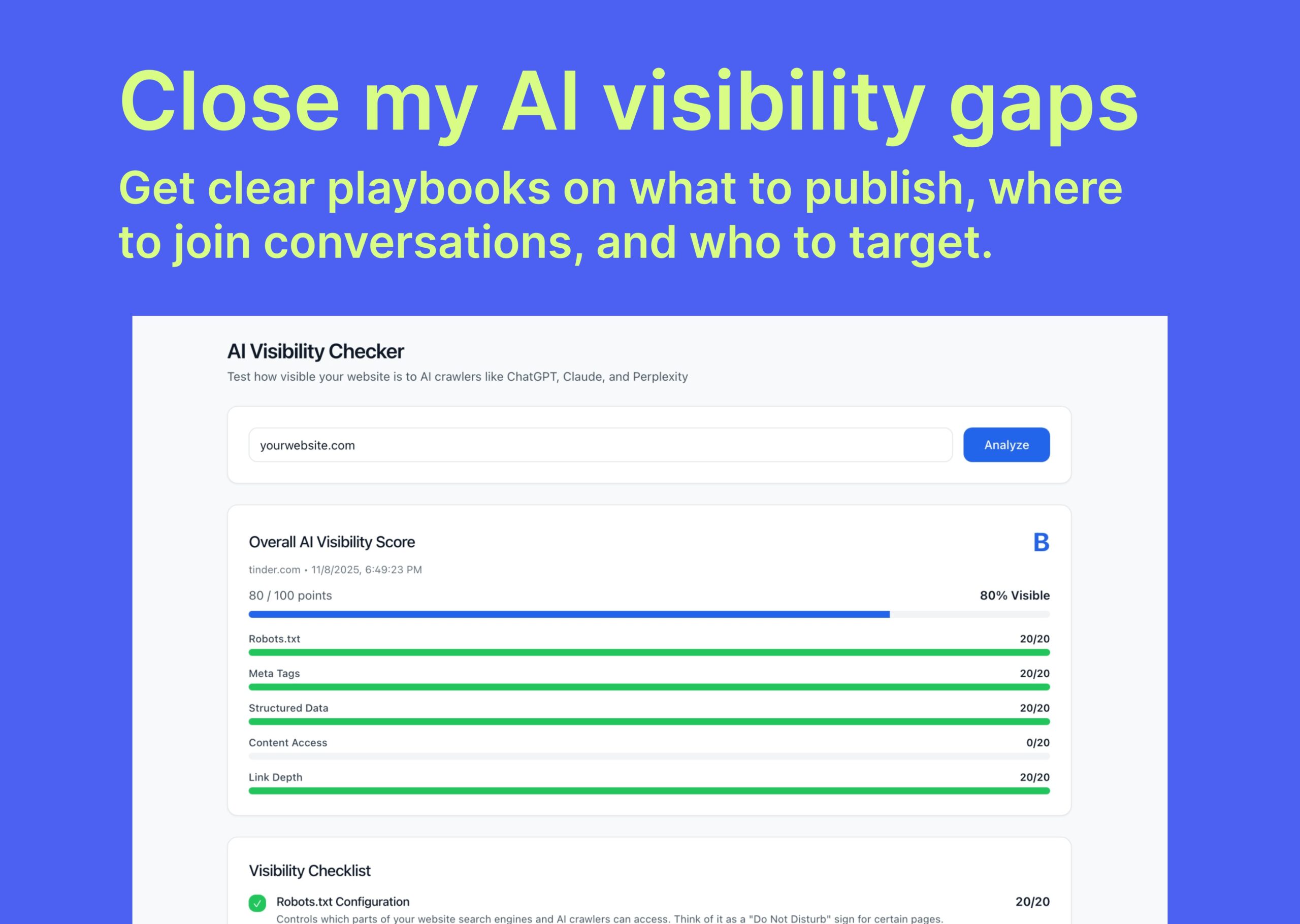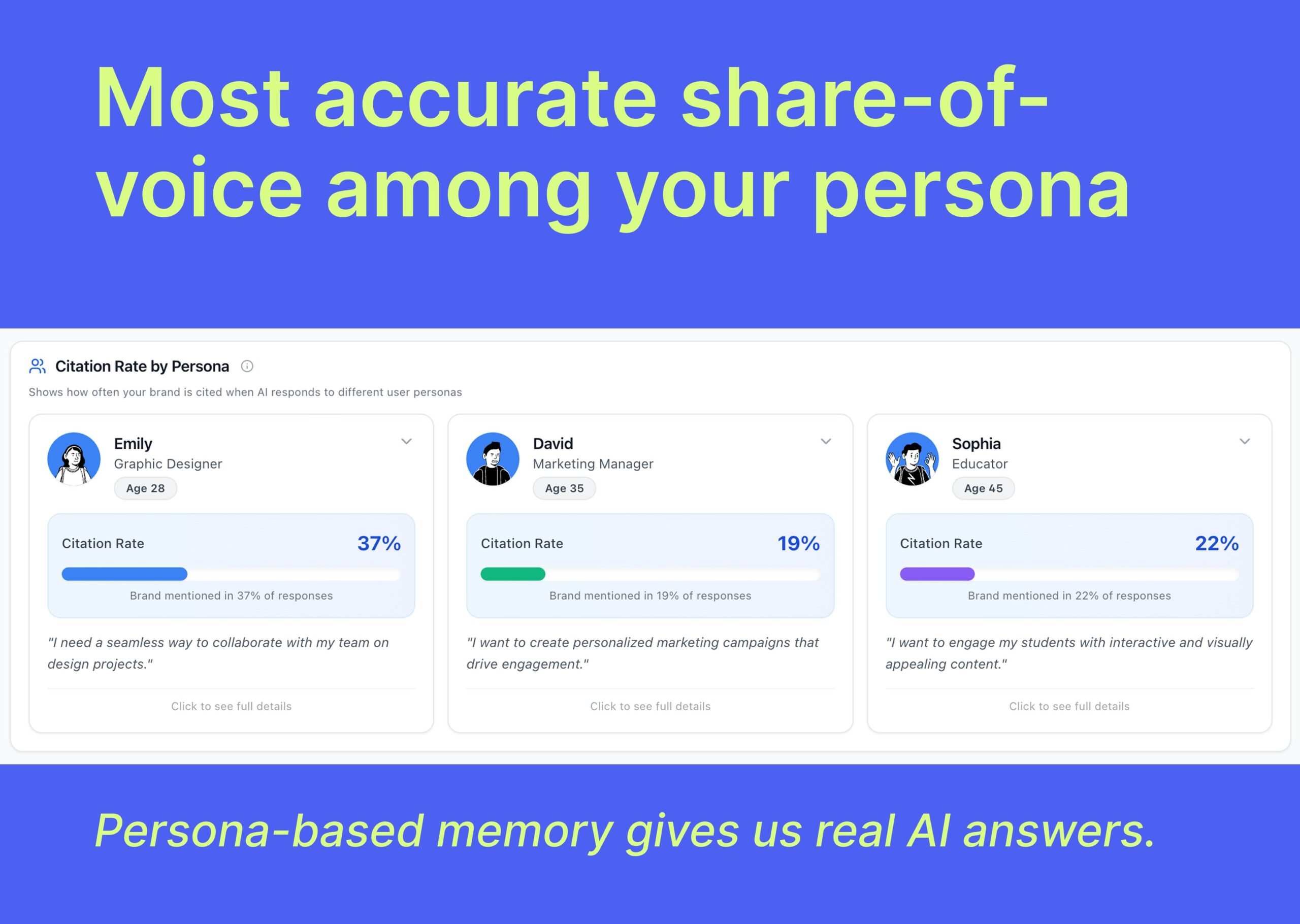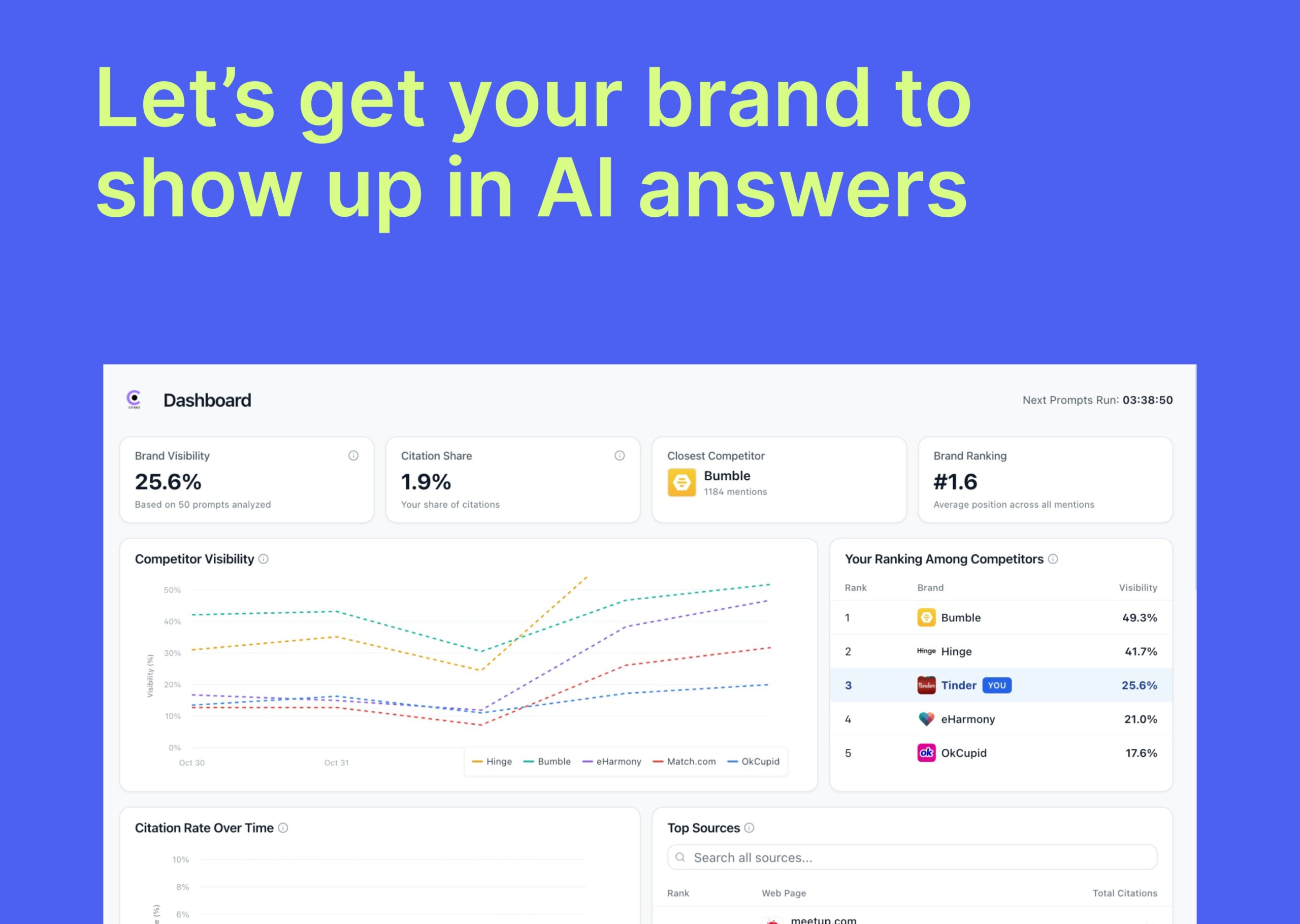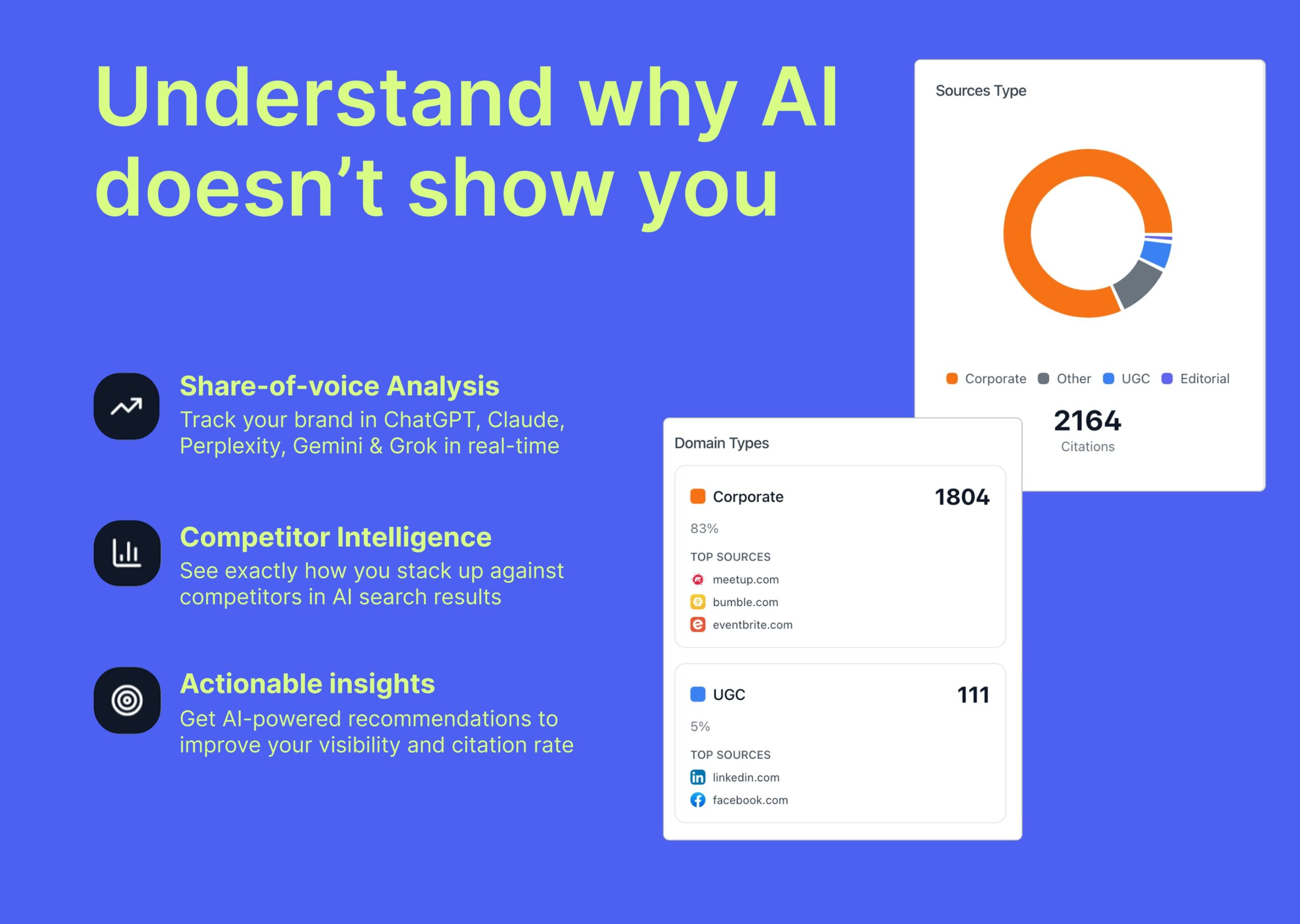Citable aide les marques à se démarquer dans les résultats de recherche basés sur l’IA. En simulant des personas réels grâce à des comptes préchauffés, il répond à des milliers de requêtes chaque jour pour analyser la part de voix et enregistrer toutes les sources citées. Cela permet d’identifier les lacunes et de recommander des actions concrètes telles que la publication d’articles spécifiques ou la participation à des forums ciblés.