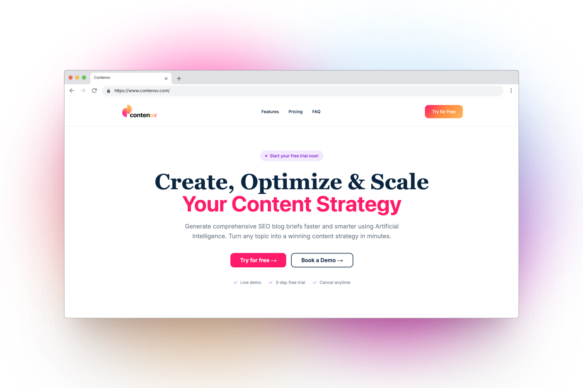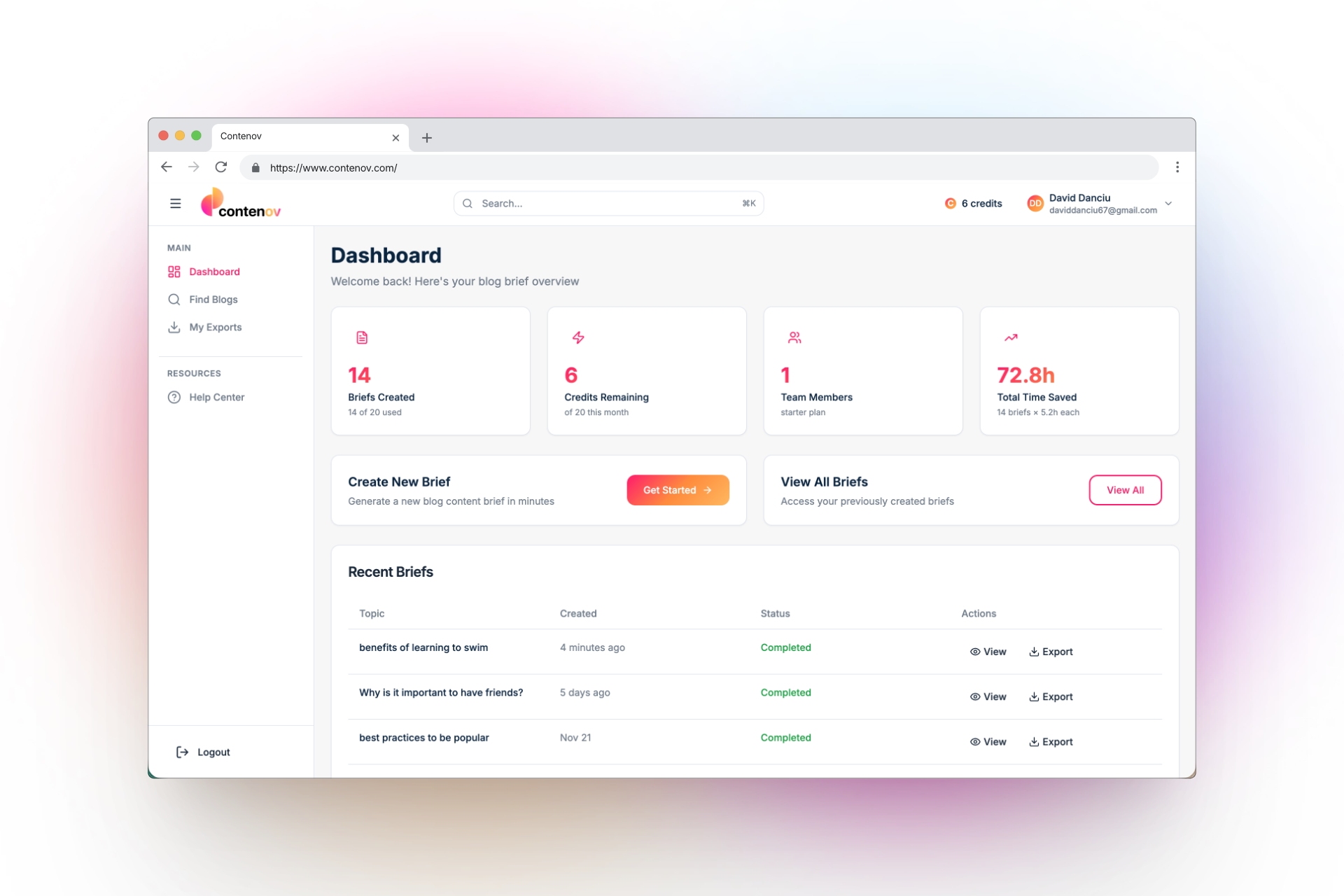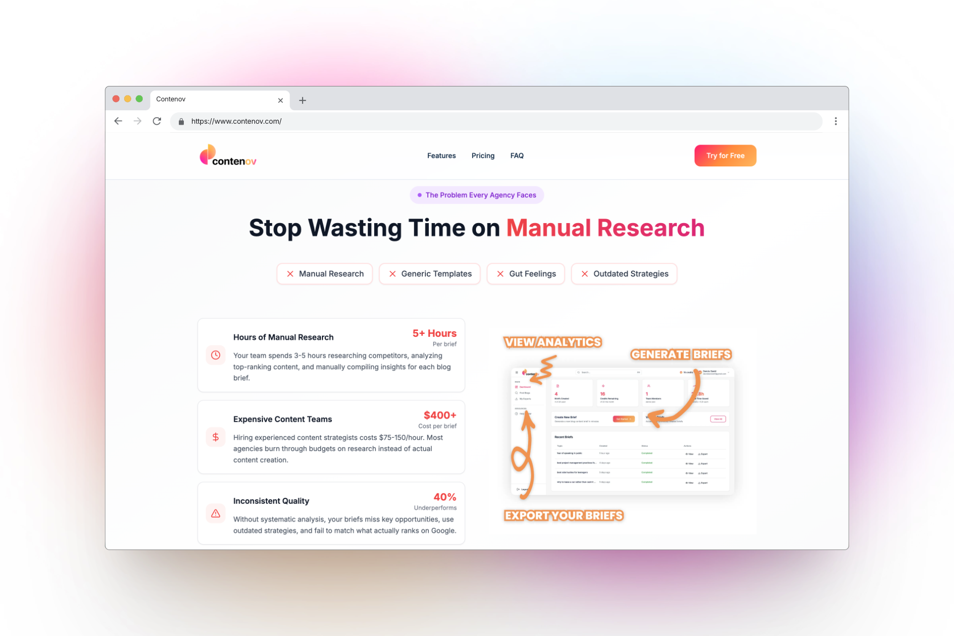 - Contenov est un outil d’IA qui transforme n’importe quel sujet en un brief de blog SEO en quelques minutes. Il analyse les 10 premiers résultats Google pour vos mots-clés, évalue les 5 pages les plus pertinentes, et crée un brief de blog SEO complet, guidé par des données. Cet outil aide à l’analyse des titres, de la structure, et à fournir des idées de mots-clés, tout en extrayant des informations clés des contenus concurrents pour offrir un plan optimisé prêt à être utilisé par les rédacteurs. Arrêtez de rechercher manuellement des sujets et travaillez efficacement avec des briefs de contenu de haute qualité !