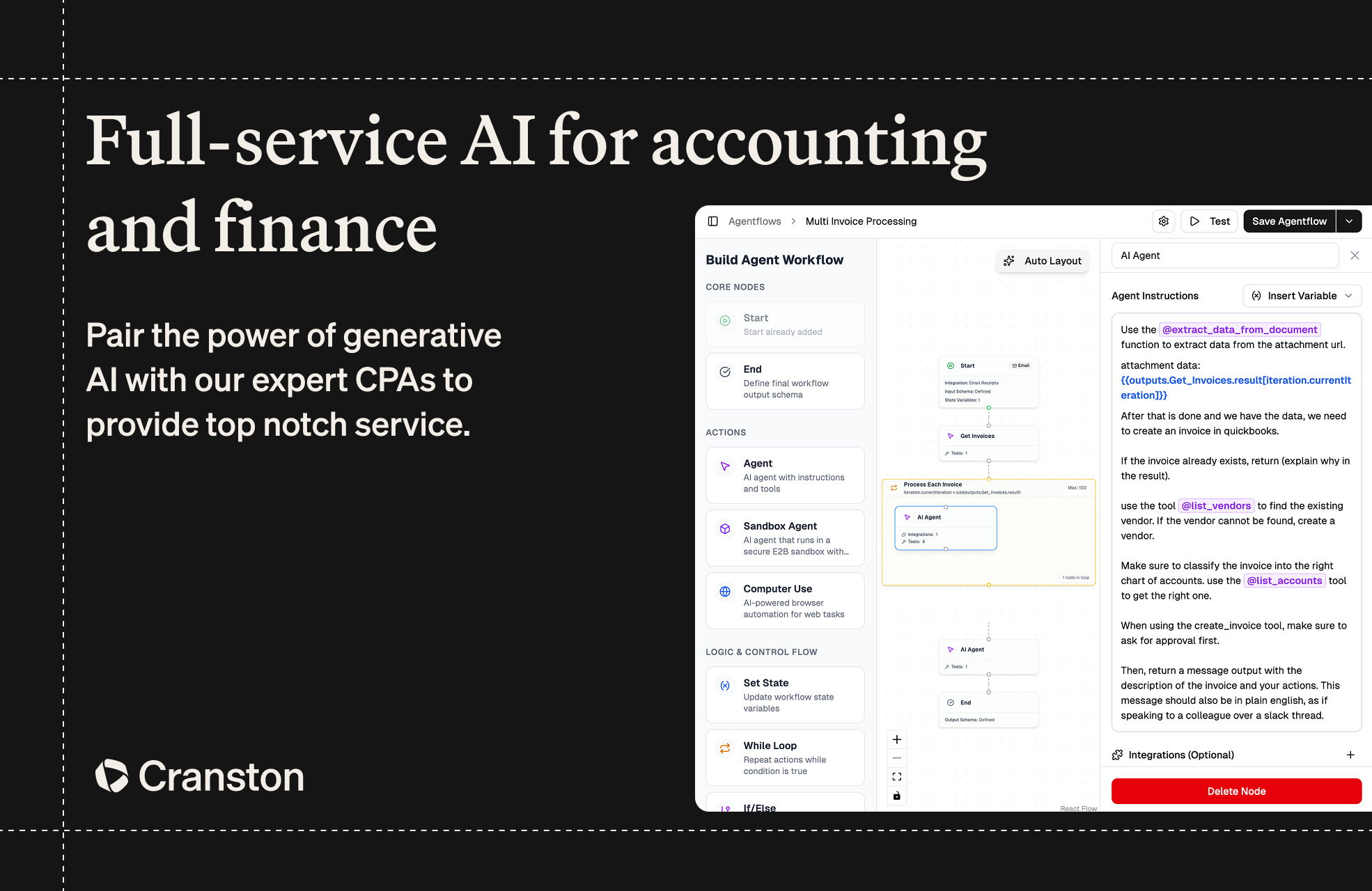 Cranston AI est une entreprise de comptabilité alimentée par l’IA, construite comme une entreprise de produits. Elle remplace le travail comptable traditionnel par des systèmes d’IA autonomes, supervisés par des CPA licenciés. Contrairement à d’autres outils de ce secteur, qui vendent des logiciels aux comptables ou ajoutent des chatbots sur des feuilles de calcul, Cranston construit le cabinet comptable lui-même, de bout en bout, pour automatiser le travail directement et garantir l’exactitude.