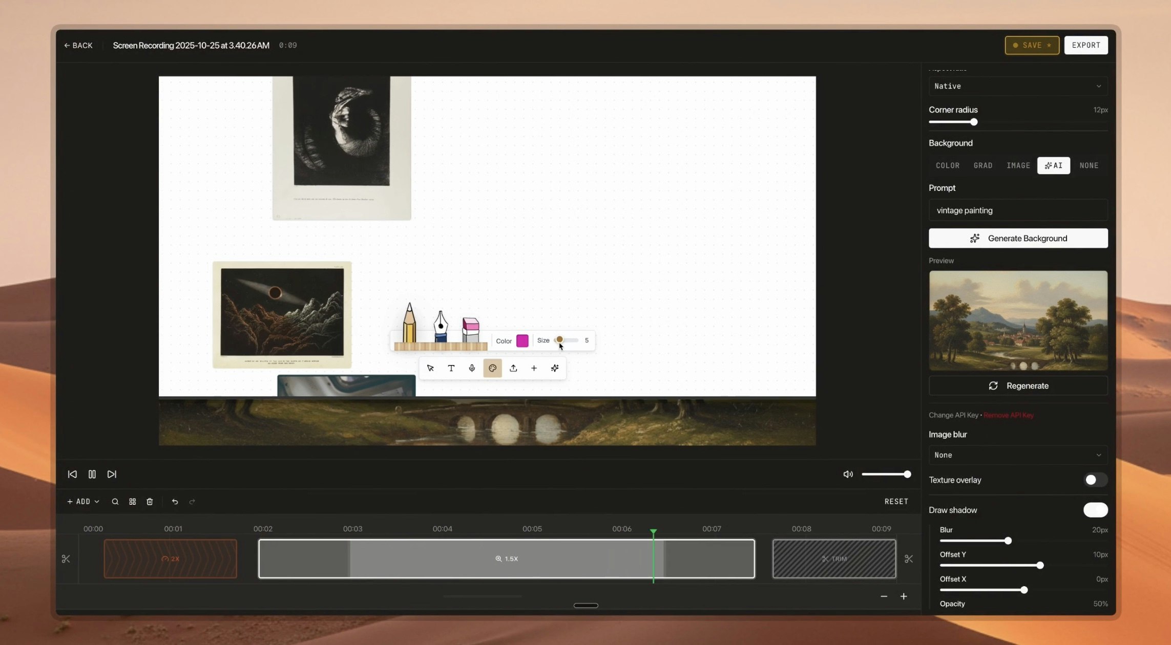 - DemoStudio est un enregistreur et éditeur conçu pour créer des démonstrations de produits attrayantes. Il vous permet d’enregistrer des vidéos d’écran, d’ajouter des zooms, de recadrer, de changer les fonds, d’ajouter des ombres et des bordures, et de générer des fonds personnalisés. Vous pouvez exporter vos vidéos dans n’importe quelle résolution jusqu’à 4K, et tout cela directement depuis votre navigateur, le tout gratuitement !