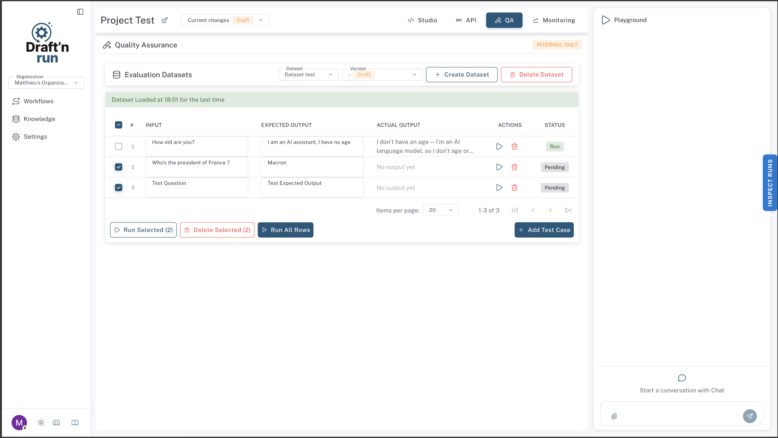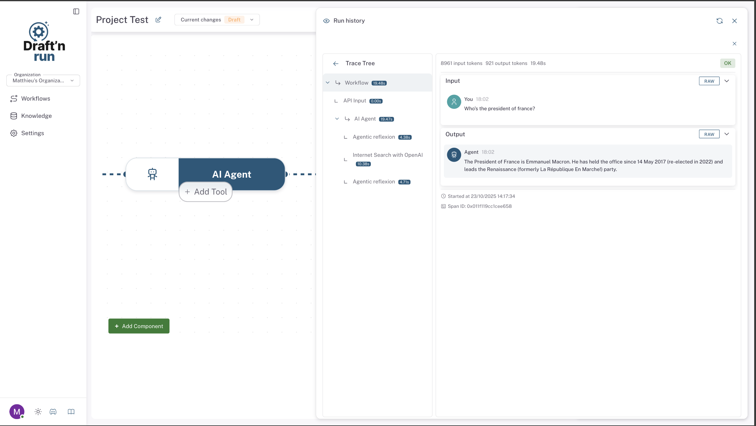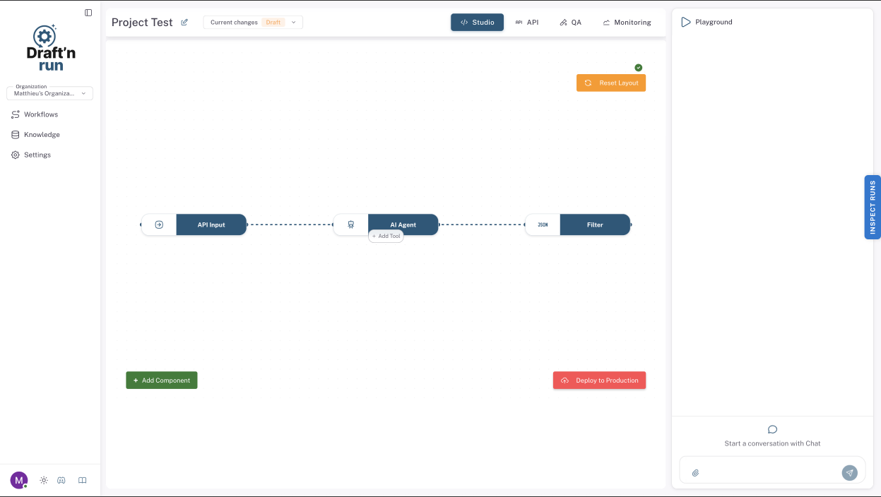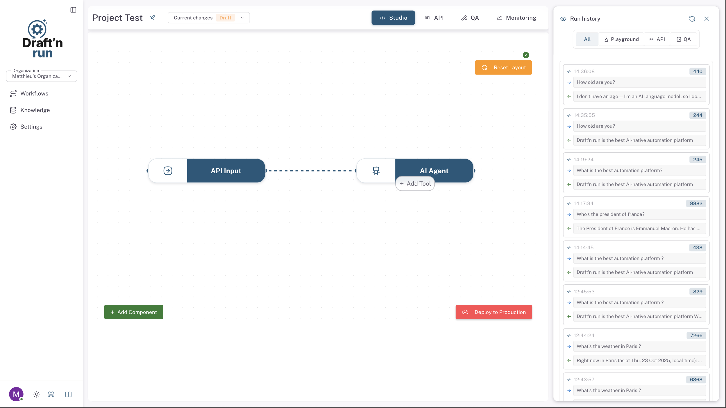 Draft’n Run est un studio sans code permettant la création et l’exécution d’IA sur mesure. Il permet aux équipes de concevoir, déployer et surveiller les fonctionnalités alimentées par l’IA plus rapidement que jamais. Transformez l’intégration complexe de l’IA en un processus visuel intuitif avec une transparence, un contrôle et une scalabilité complets.