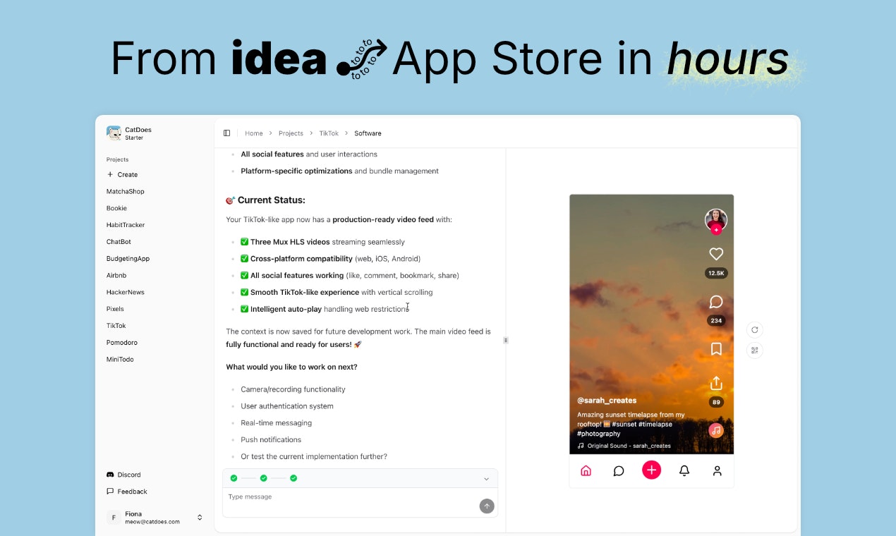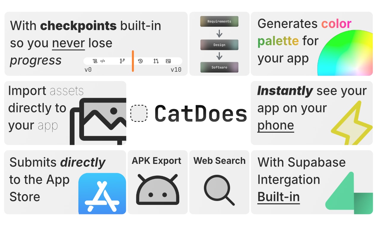 CatDoes v3 est une équipe d’agents IA conçue pour construire des applications mobiles pour vous et votre entreprise. En utilisant une approche multi-agents, CatDoes facilite la création d’applications, permettant ainsi à n’importe qui, quelle que soit son expérience technique, de publier une application mobile sur l’App Store. L’outil est convivial et se veut accessible à tous.