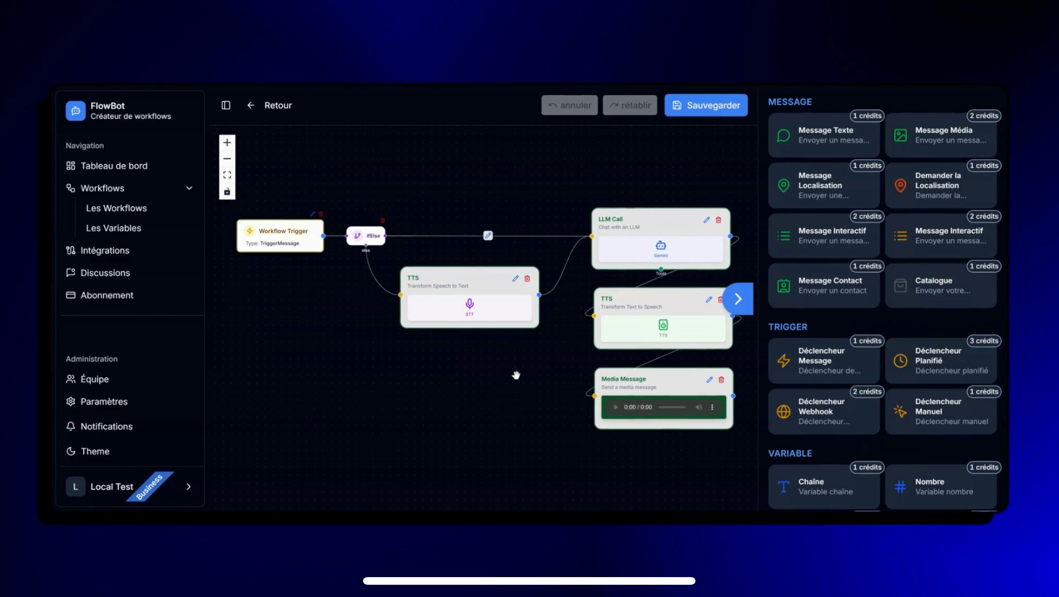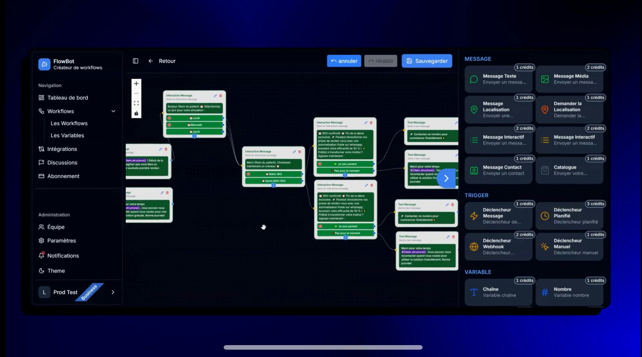 - FlowBot est une plateforme sans code qui permet aux entreprises d’automatiser leurs interactions clients sur WhatsApp. Grâce à son constructeur intuitif par glisser-déposer, les utilisateurs peuvent créer facilement des workflows pour les ventes, le support et le marketing sans écrire de ligne de code.