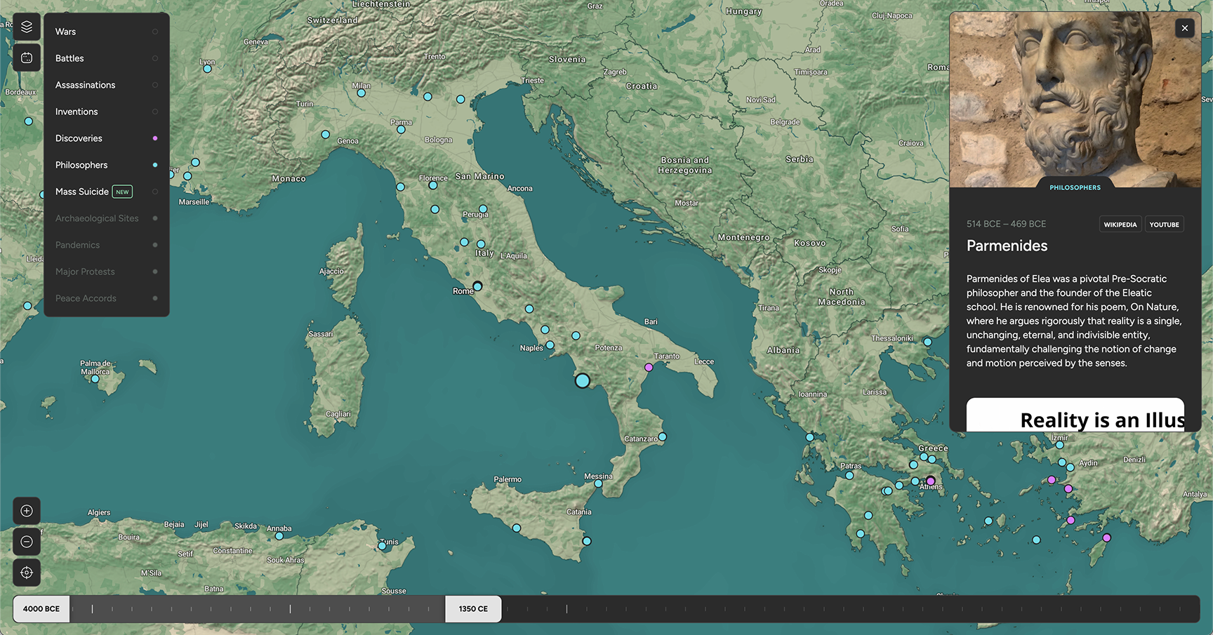 Globe of History est un outil interactif qui permet d’explorer 6 000 ans d’histoire à travers un globe 3D. Les utilisateurs peuvent visualiser des batailles, des philosophes et des inventions tout en filtrant leur recherche par époque et catégorie. Grâce à une factory de données AI personnalisée, cet outil offre une expérience enrichissante pour comprendre comment l’histoire évolue à travers le monde. Actuellement, il est disponible uniquement sur desktop.