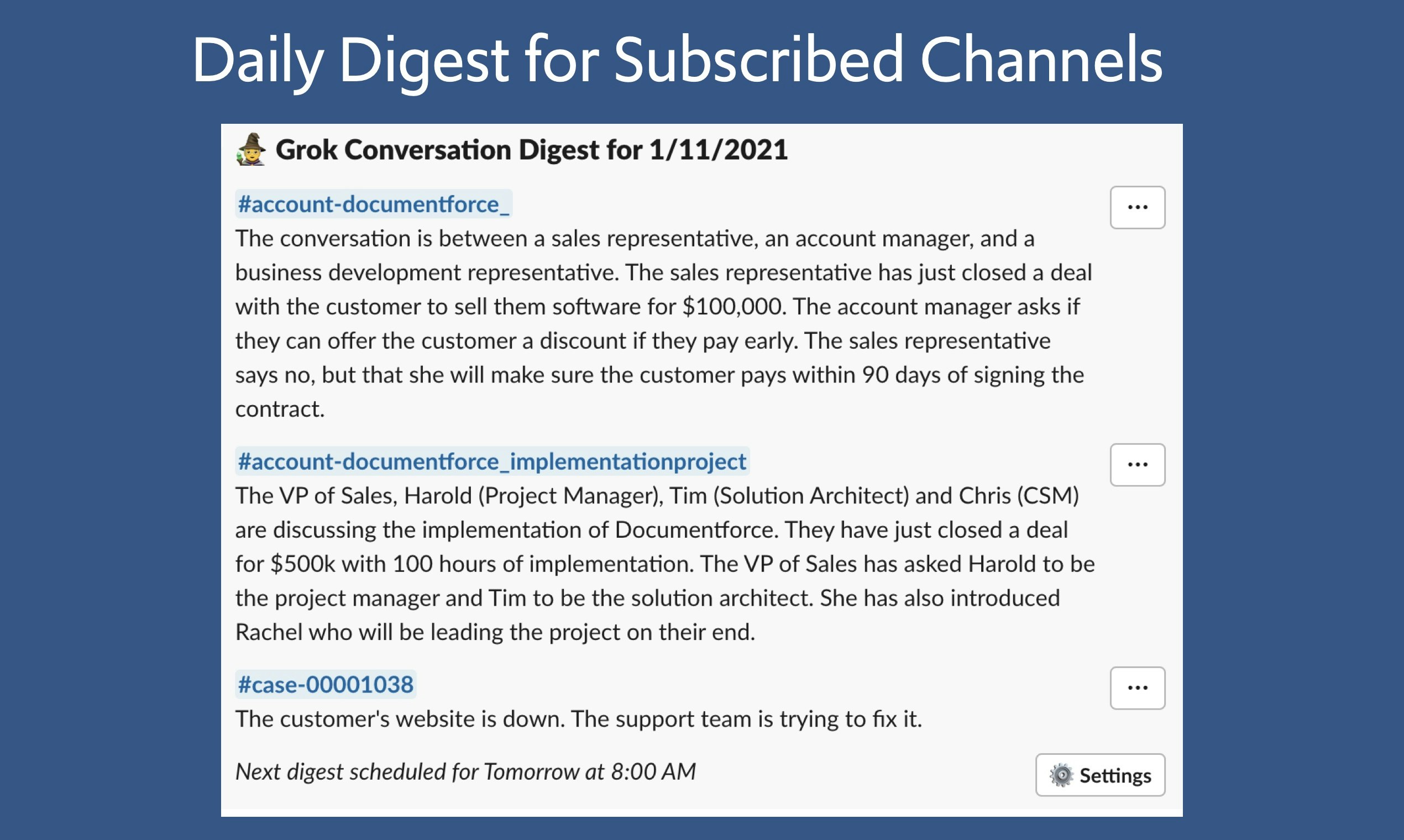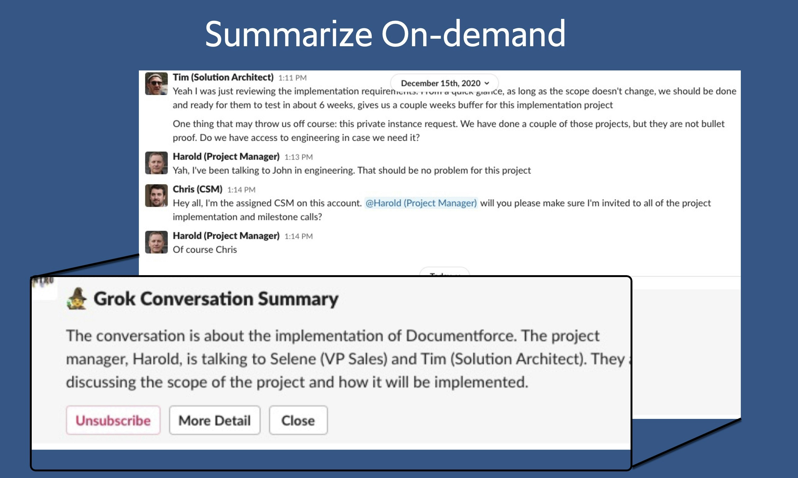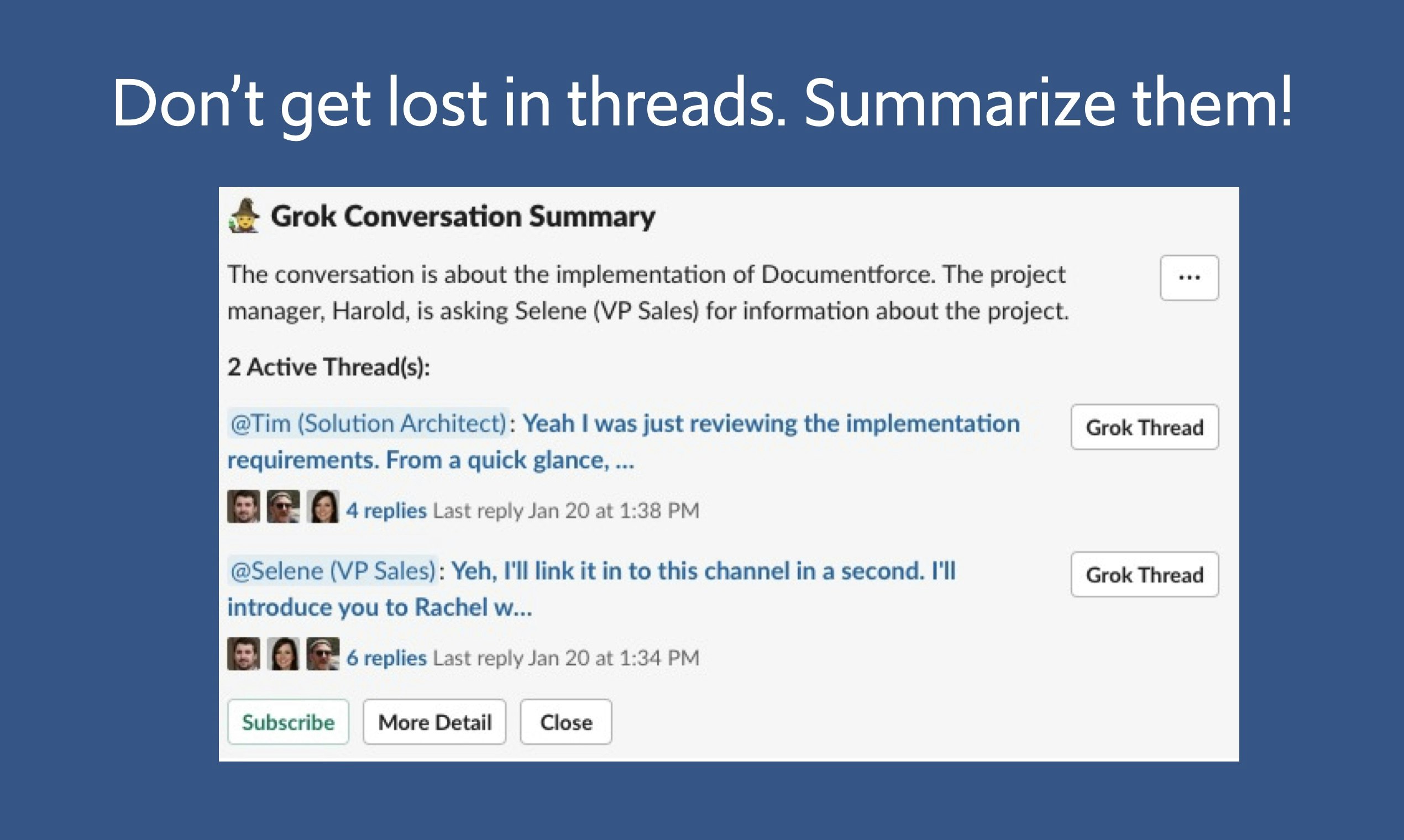 - Grok 4.1 permet de résumer les canaux Slack grâce à l’IA sophistiquée de GPT-3. Il aide les utilisateurs à gérer le flux constant d’informations en fournissant des résumés sur demande ou sous forme de digest quotidien. Cet outil est idéal pour ceux qui ont besoin de rester informés tout en économisant du temps précieux.