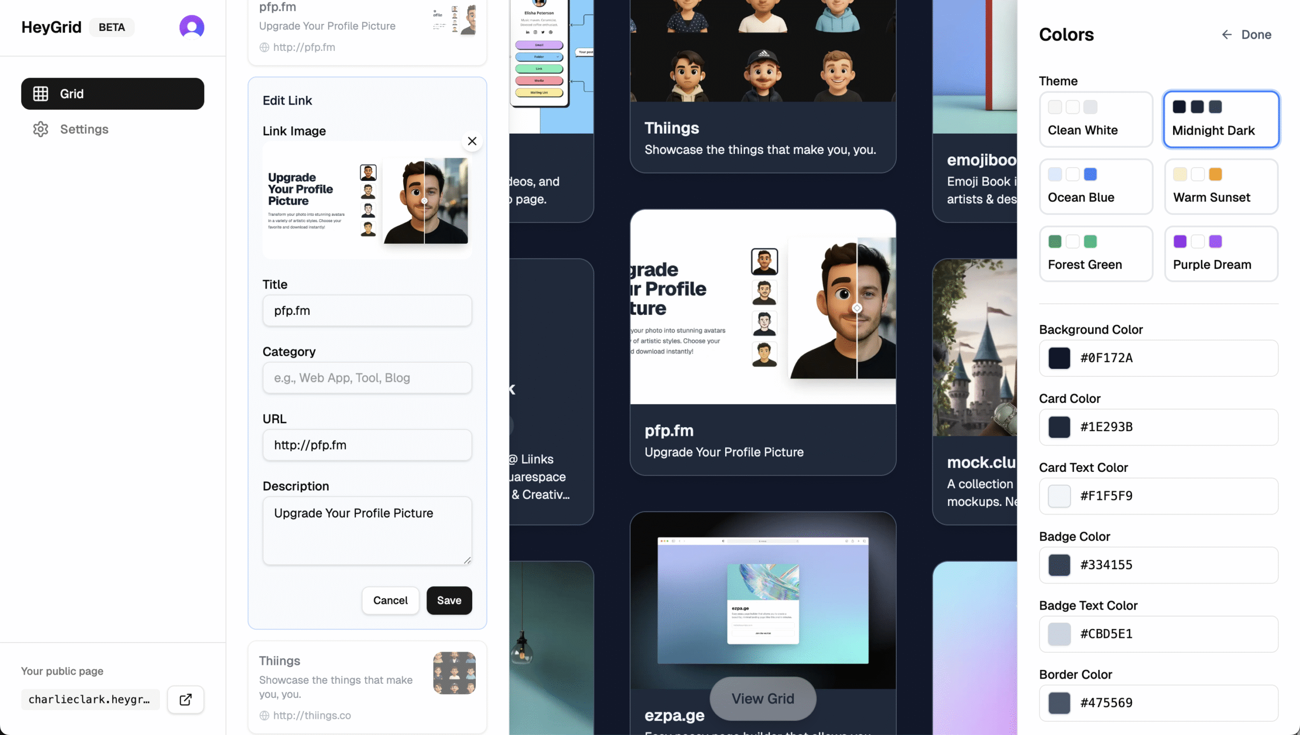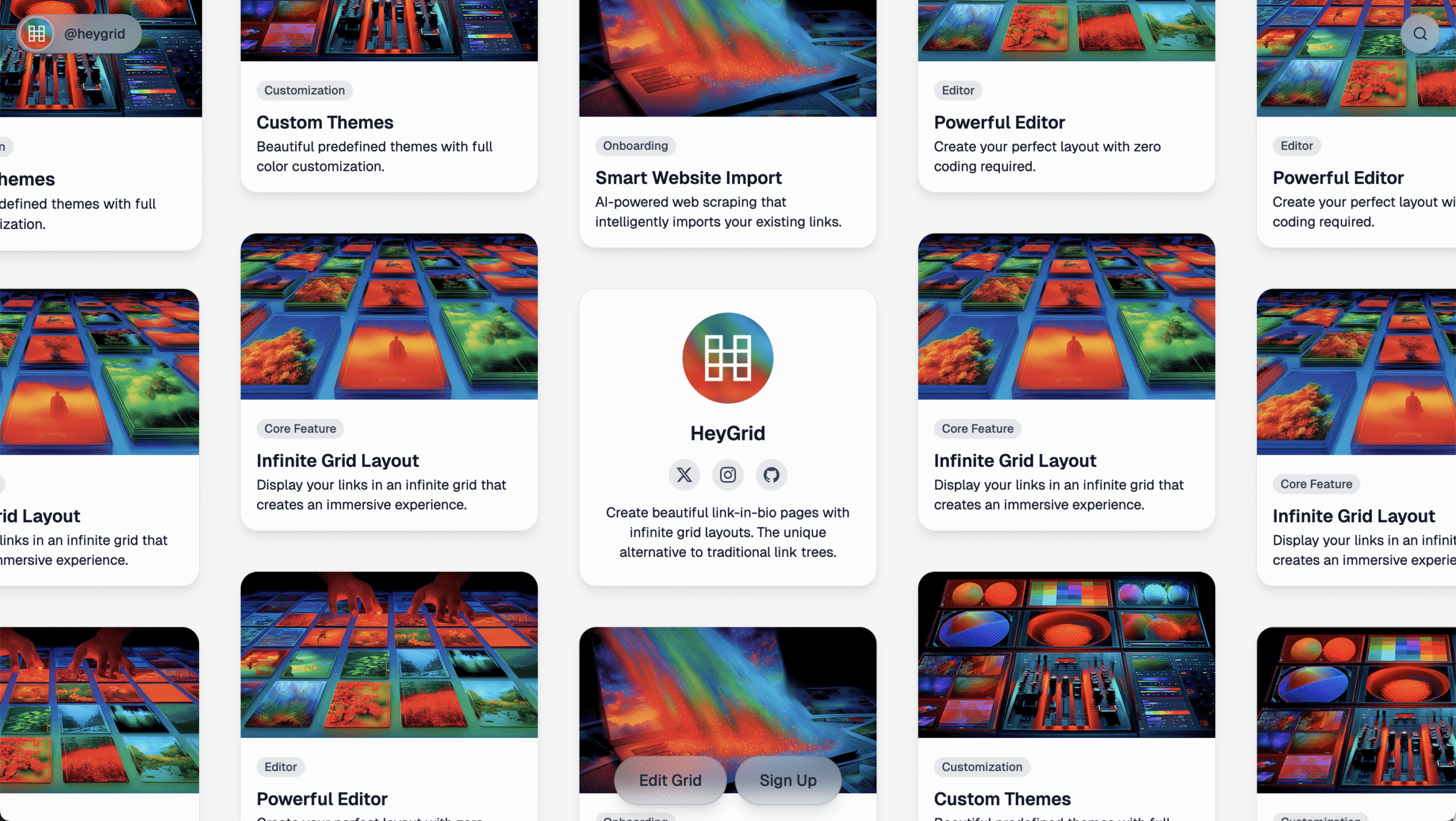 - HeyGrid est un outil de lien en bio qui permet de créer des pages attrayantes avec des mises en page de grille infinie. C’est une alternative unique aux arbres de liens traditionnels, offrant des options de personnalisation et une interface facile à utiliser.