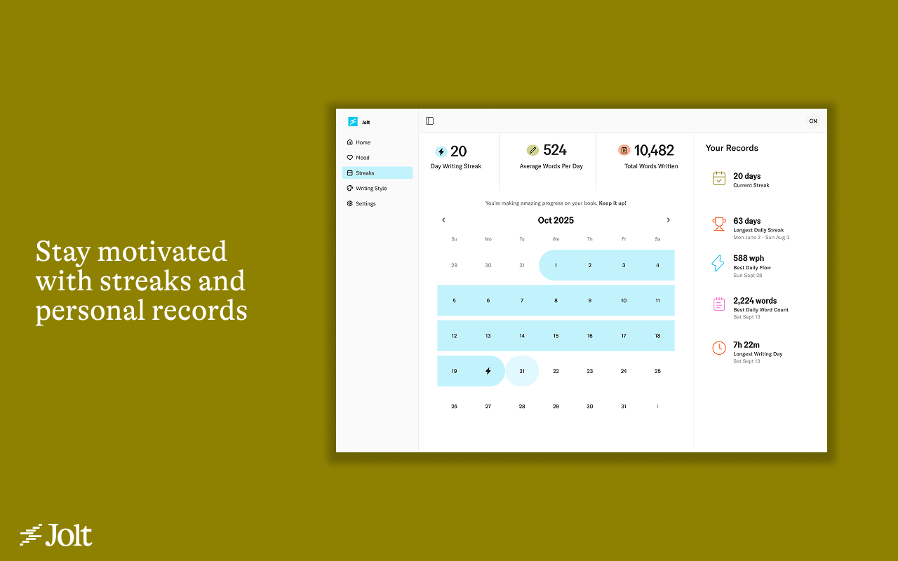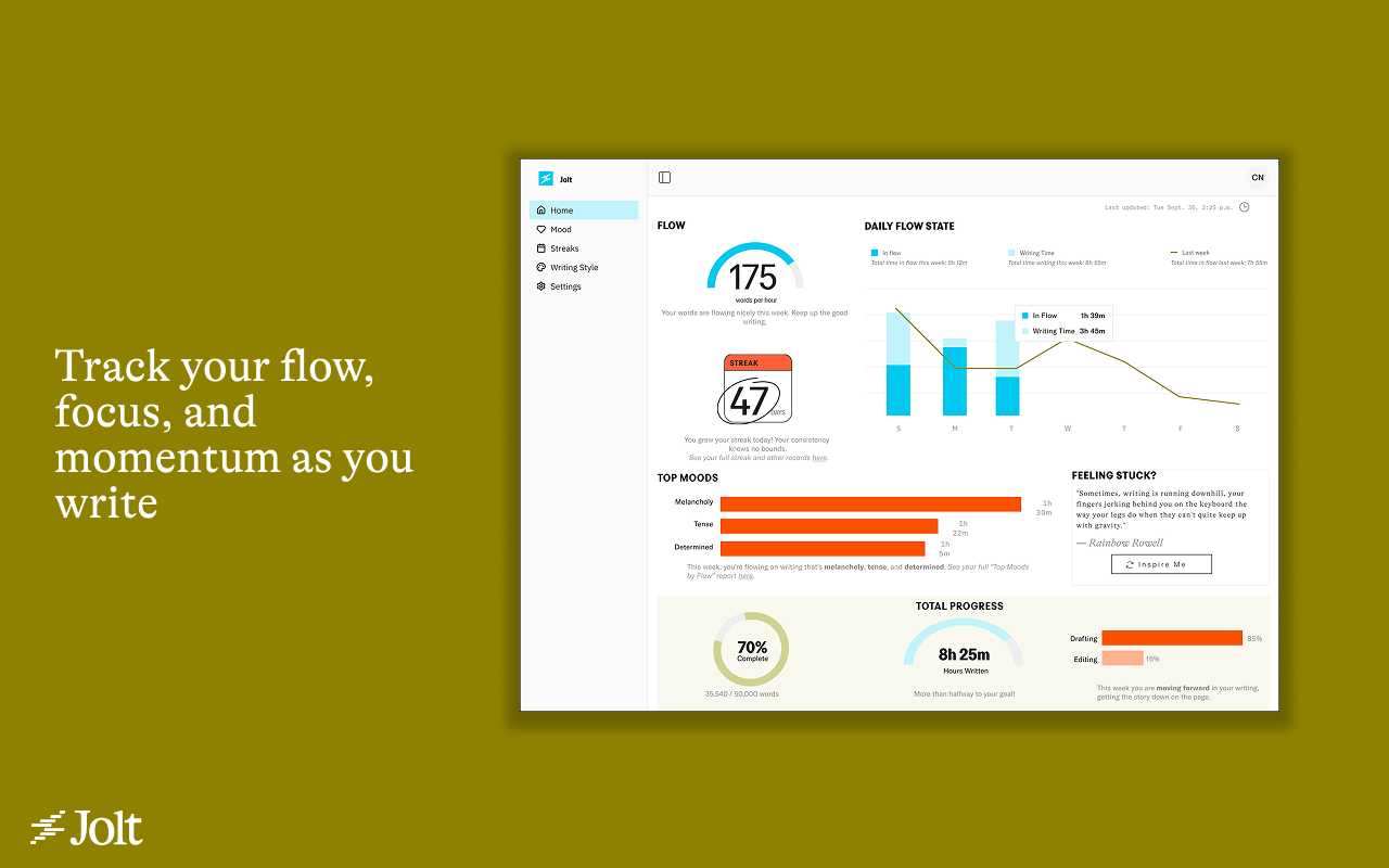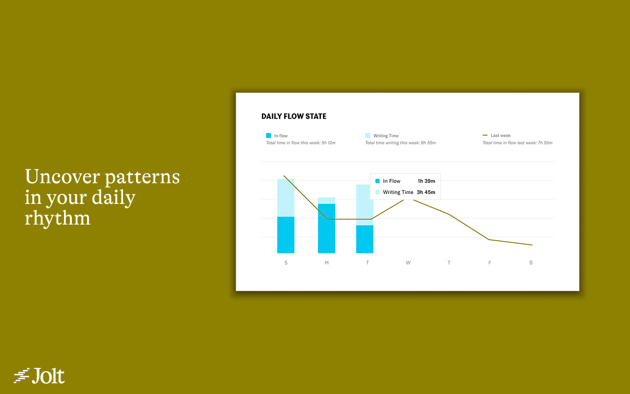- Jolt est un nouvel outil pour les écrivains qui permet de suivre leur flux, leur concentration et leur élan, à l’image de la manière dont on suit ses courses sur Strava. En combinant des analyses en temps réel et de la motivation, Jolt aide les écrivains à se présenter de manière cohérente et à donner vie à leurs histoires, le tout sans écrire avec l’IA ou faire des suggestions.