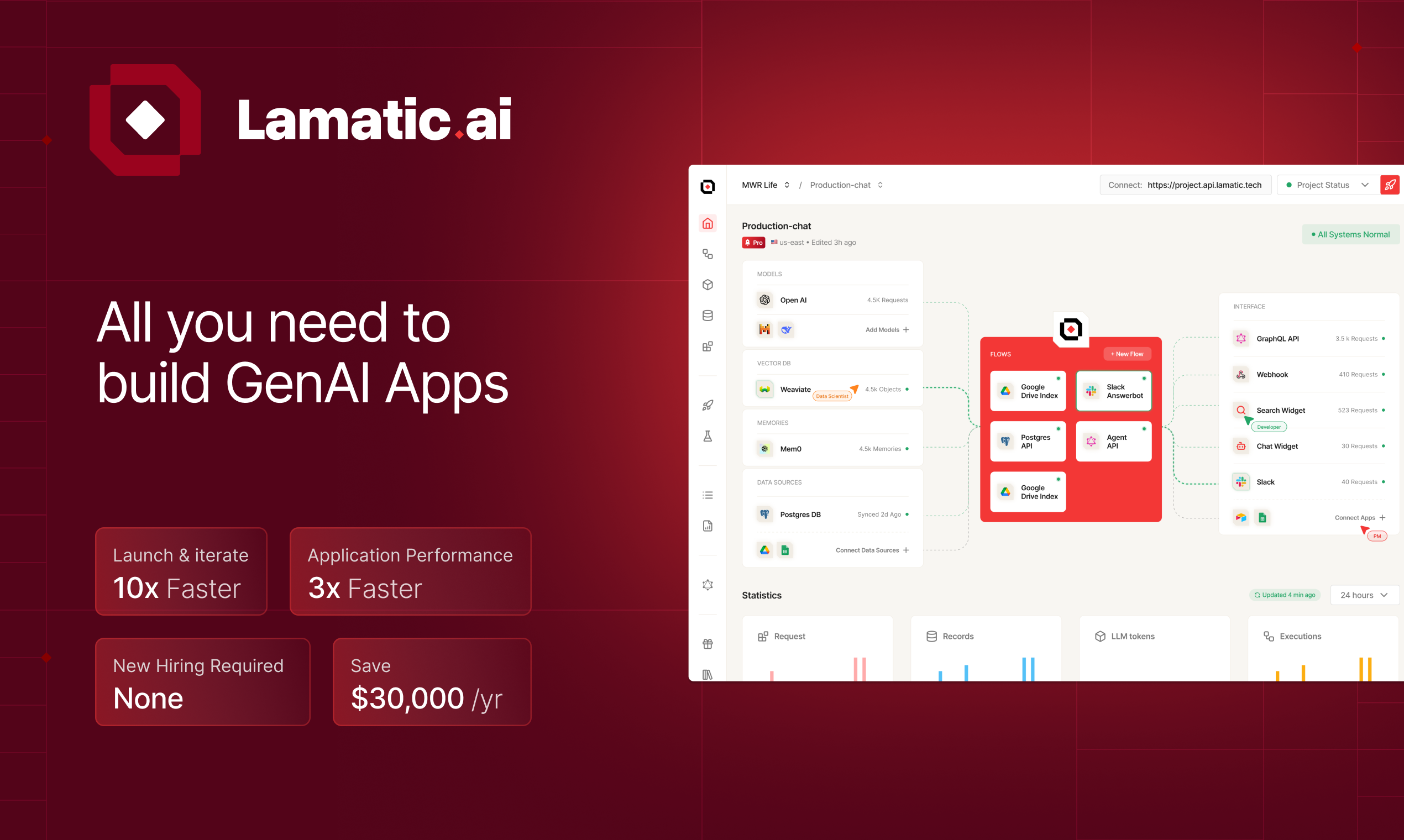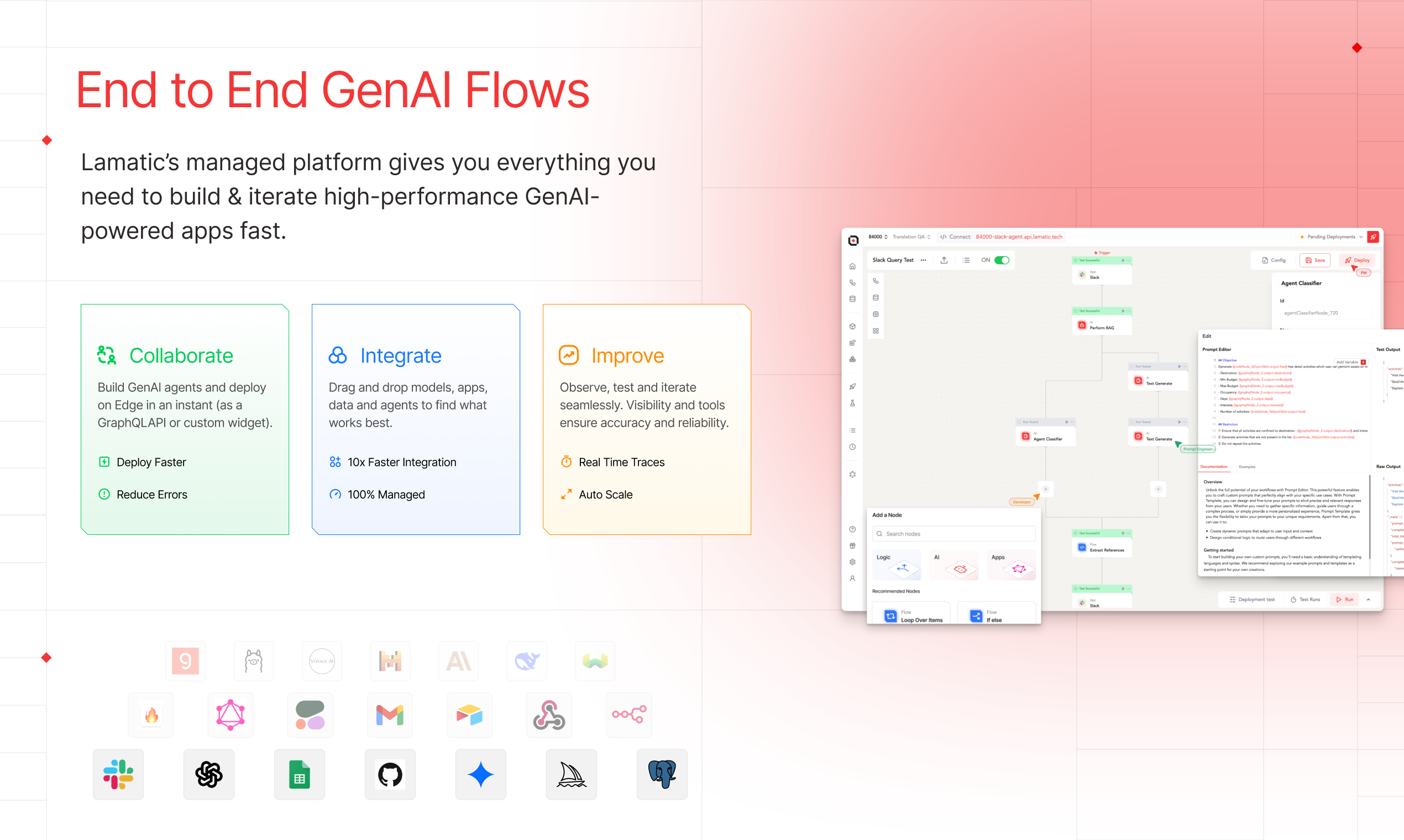 Lamatic 3.0 est une plateforme PaaS gérée qui permet de créer des agents d’intelligence artificielle via un constructeur visuel en low-code. Elle intègre une base de données VectorDB et facilite les intégrations avec des applications et des modèles, permettant de construire, tester et déployer des applications GenAI performantes en edge.