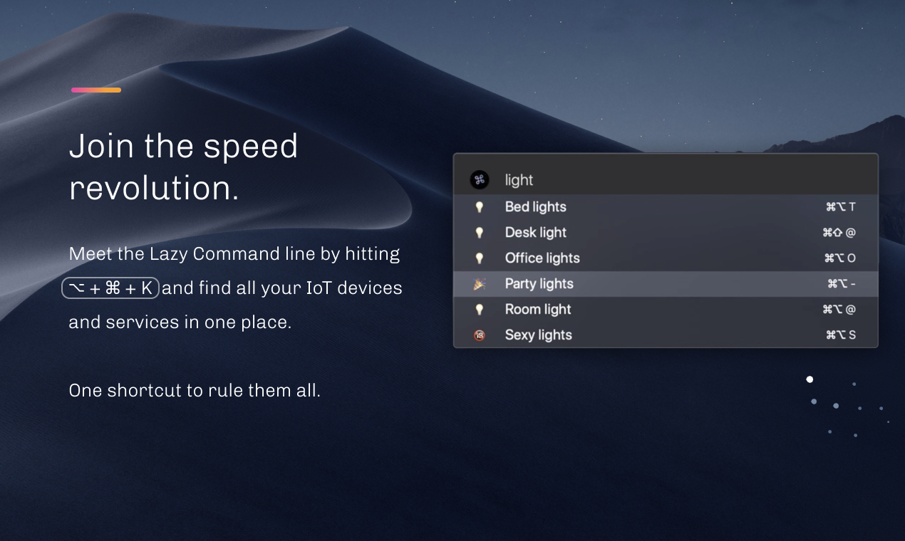 Lazy for Notion permet de contrôler votre environnement via une seule commande clavier. Grâce à des commandes pilotées par le clavier, vous pouvez gérer facilement tous vos appareils IoT directement depuis votre Mac. En appuyant sur ⌥ + ⌘ + K, vous accédez à la commande Lazy, qui centralise tous vos dispositifs et services en un seul endroit. Une solution simple pour optimiser votre expérience numérique.
