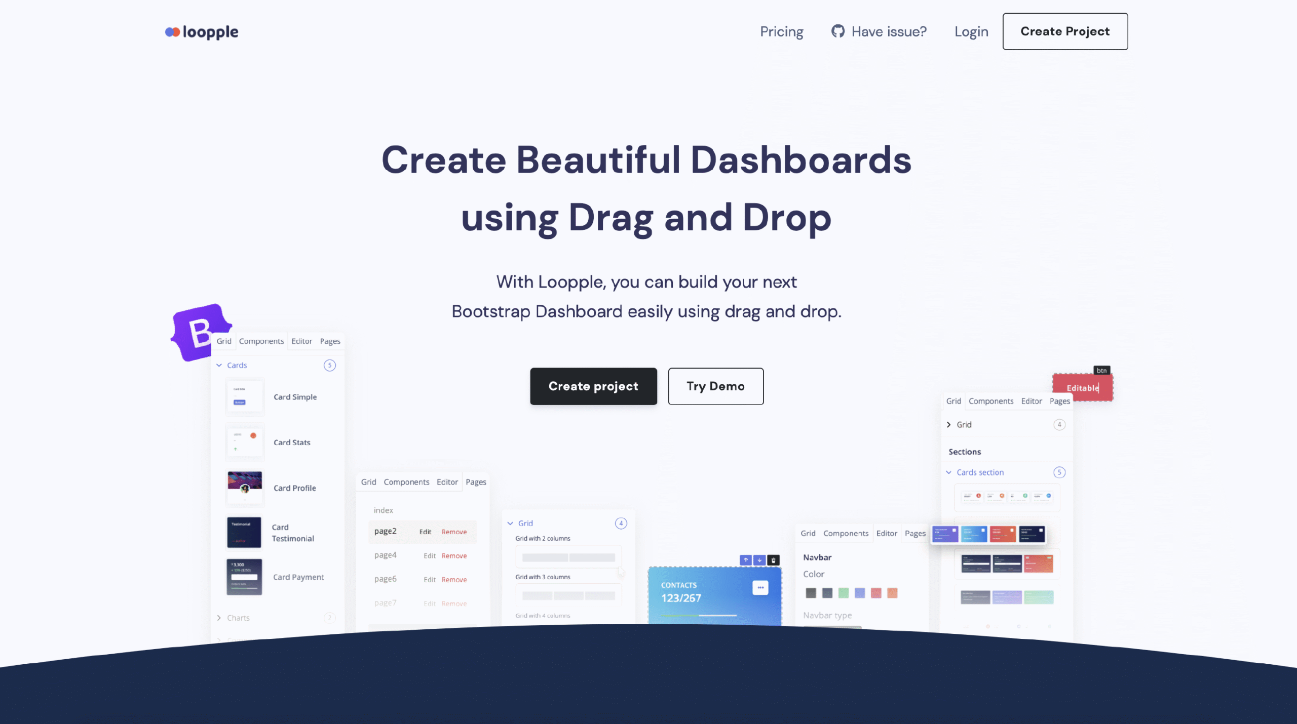 - Loopple est un constructeur de tableaux de bord par glisser-déposer qui vous permet de créer des panneaux d’administration beaux et dynamiques pour votre startup et votre entreprise en quelques minutes. Il offre une interface conviviale pour assembler des éléments visuels et faciliter l’analyse des données.