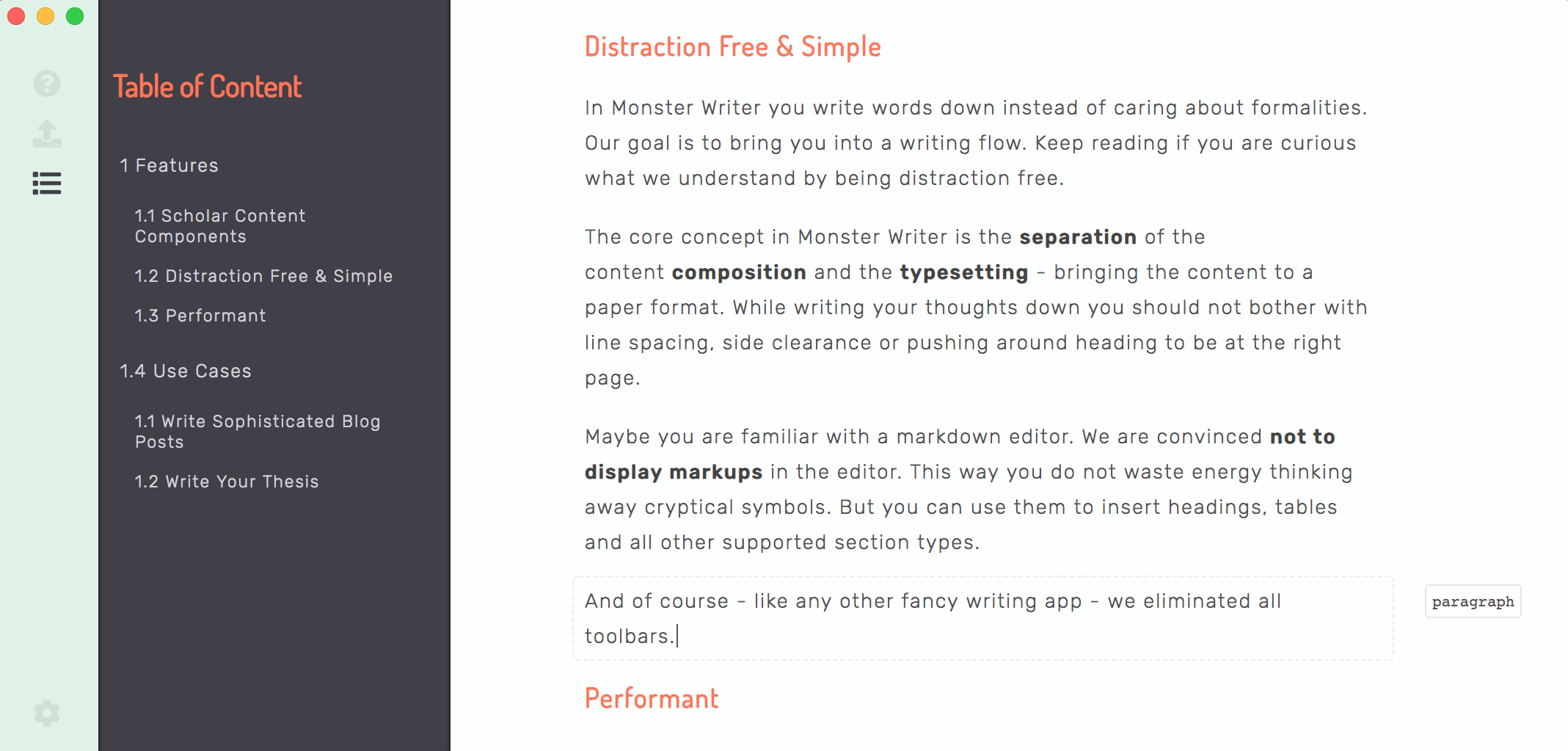 MonsterWriter est l’outil idéal pour rédiger vos thèses, articles ou tout type de contenu sans les distractions habituelles. En vous permettant de vous concentrer sur votre contenu plutôt que sur la mise en page, il élimine les tâches inutiles qui entravent votre processus d’écriture. Avec MonsterWriter, finies les soucis de formatage. Vous pouvez vous concentrer uniquement sur ce qui compte vraiment : votre message.