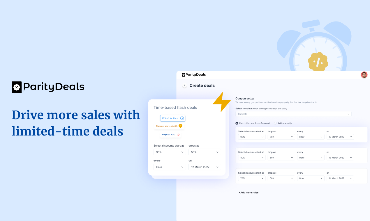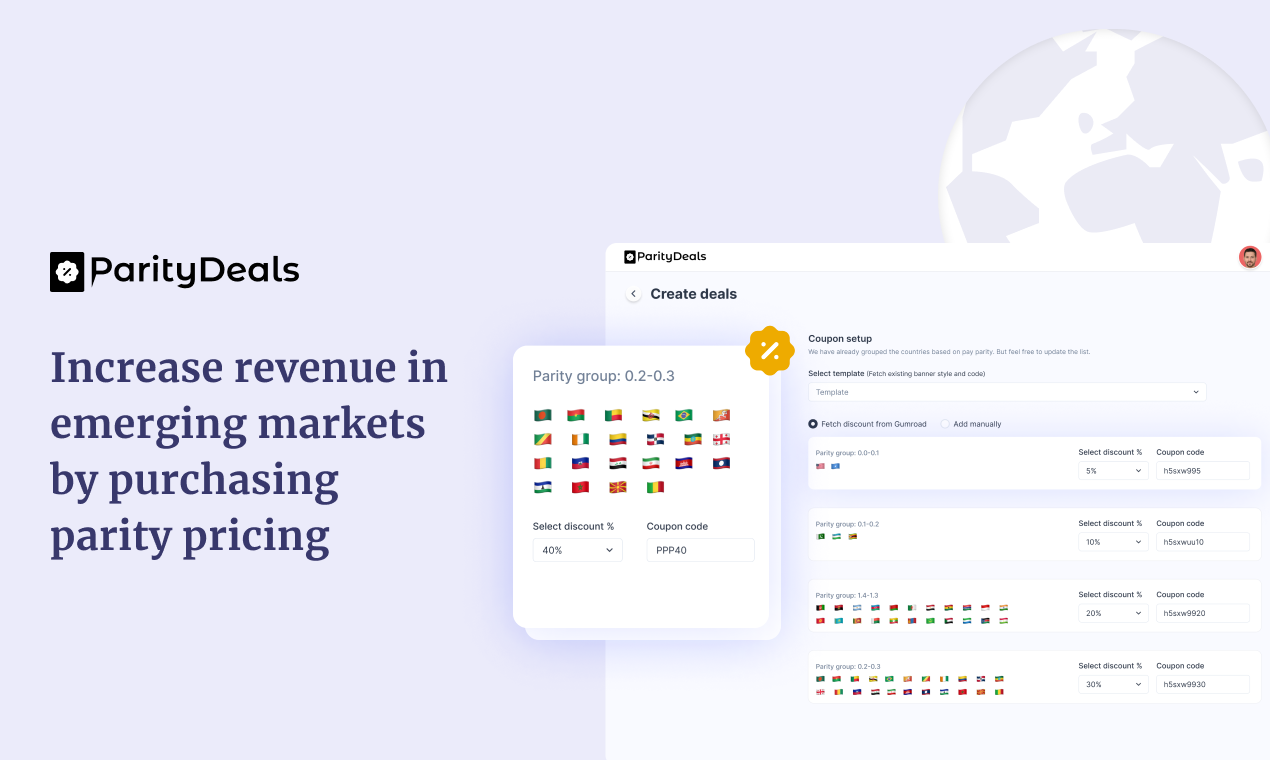ParityDeals est un outil qui automatise la tarification dynamique, permettant d’ajuster les prix en fonction de l’emplacement, du temps ou des jours fériés, afin d’augmenter les conversions des ventes des marchés émergents jusqu’à 10x.