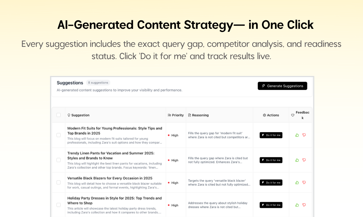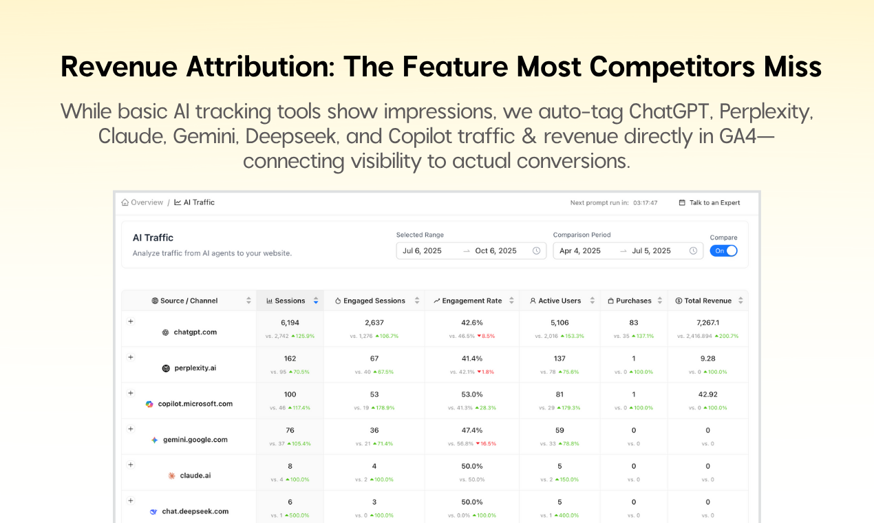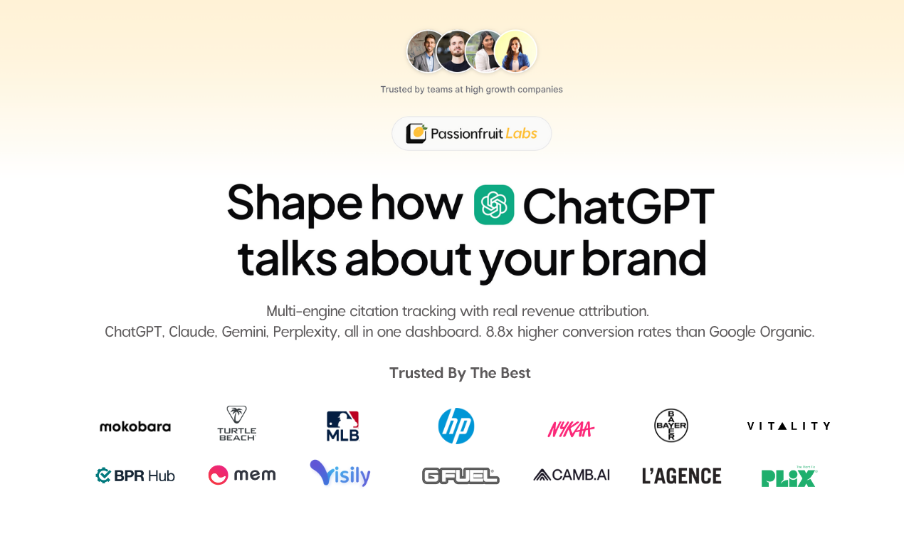Passionfruit Labs transforme les mentions et citations AI en revenus. Suivez les revenus réels des recherches AI, découvrez quelles pages concurrentes obtiennent des citations, comprenez le sentiment des LLMs envers votre marque et recevez des recommandations instantanées qui fonctionnent vraiment. Évitez de surpayer pour des outils GEO traditionnels et laissez Passionfruit Labs prouver rapidement votre ROI.