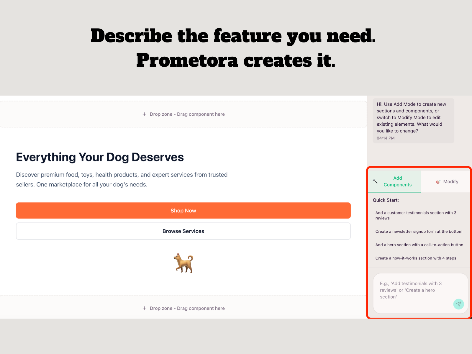 - Prometora permet à quiconque de créer une marketplace en ligne complète à partir d’un seul prompt. Sans modèles, sans codage, il suffit de décrire votre idée et d’obtenir une plateforme prête à l’emploi avec des annonces, des paiements, des messages et des avis intégrés. Idéal pour les fondateurs, les créateurs et les entrepreneurs qui souhaitent lancer rapidement, valider des idées et développer leurs marketplaces, le tout au même endroit. Lancez votre marketplace en quelques heures, pas en plusieurs semaines.