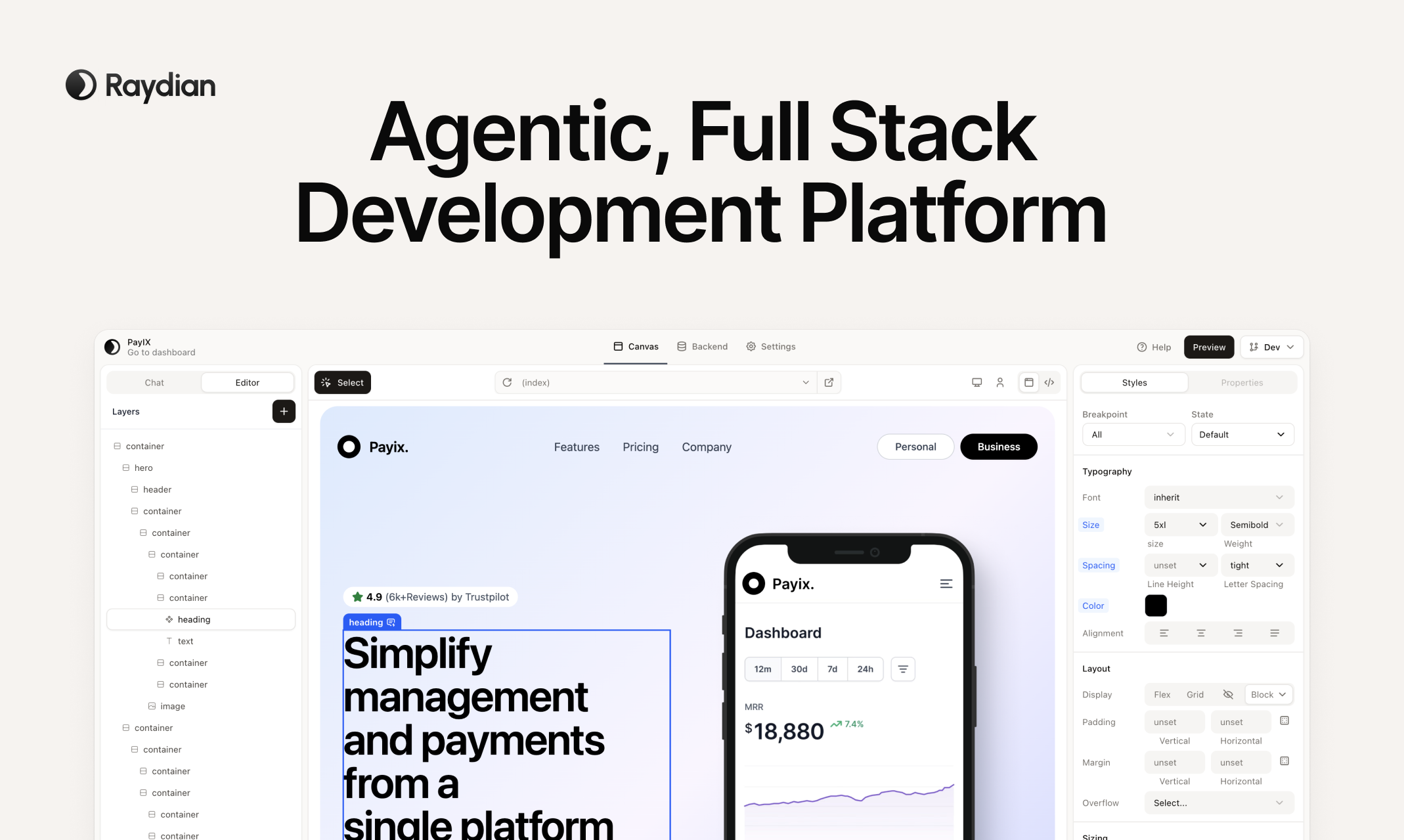 Raydian est une plateforme de développement de produits intégrant l’intelligence artificielle, conçue pour permettre la création fiable d’applications web. Grâce à une approche structurée, Raydian offre une expérience de développement efficace avec un éditeur visuel et un backend intégré, qui comprend la gestion de la base de données, l’authentification et l’hébergement, facilitant ainsi le travail des développeurs et entrepreneurs.