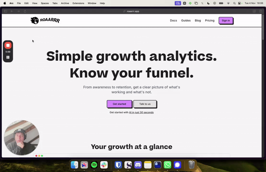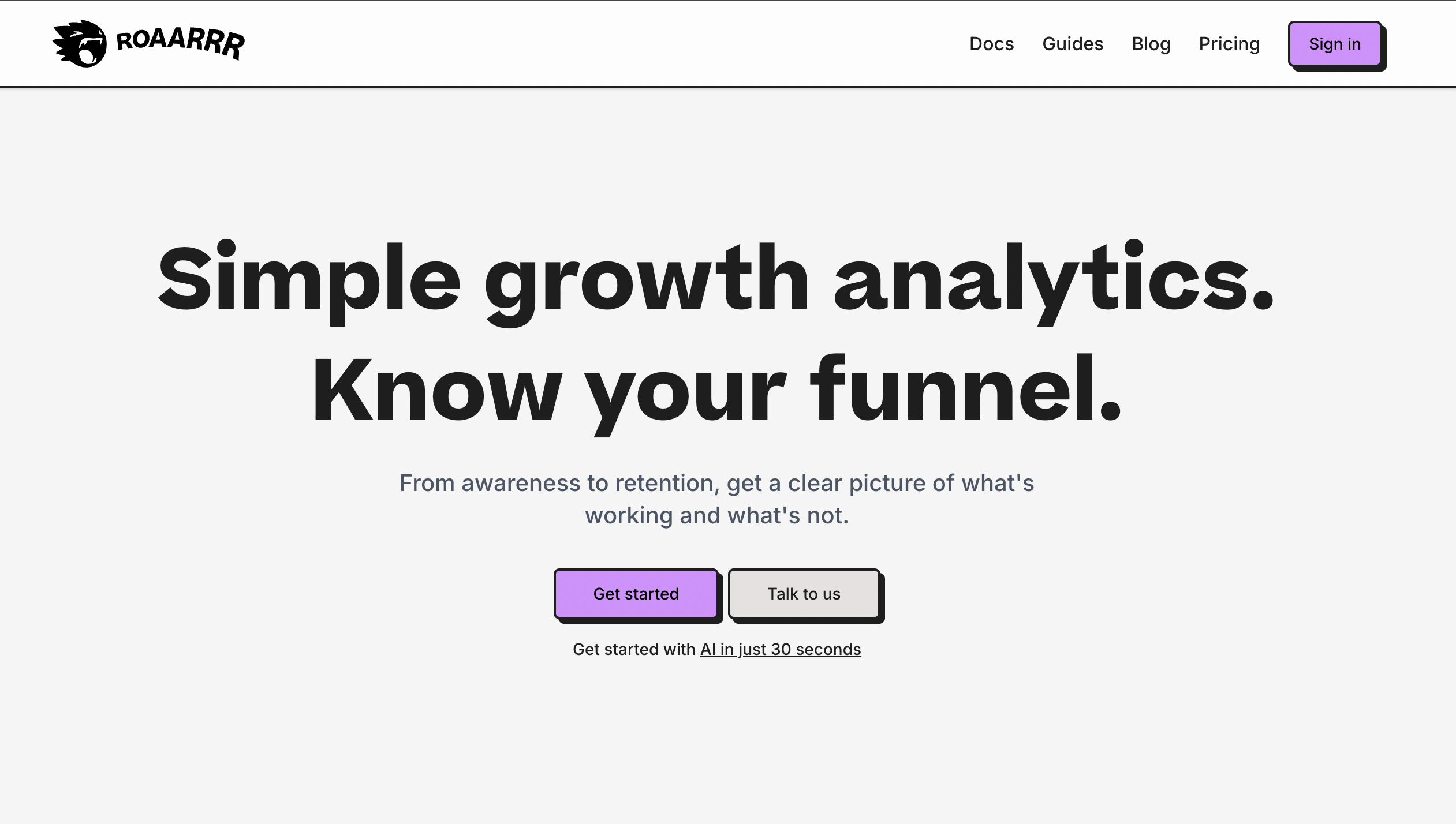 ROAARRR est un outil d’analyse de croissance simple qui permet de comprendre votre entonnoir d’acquisition, de conversion et de rétention. Il met fin à la nécessité de jongler entre plusieurs plateformes d’analyse en offrant une vue d’ensemble cohérente de toutes les étapes de votre entonnoir dans un seul outil.