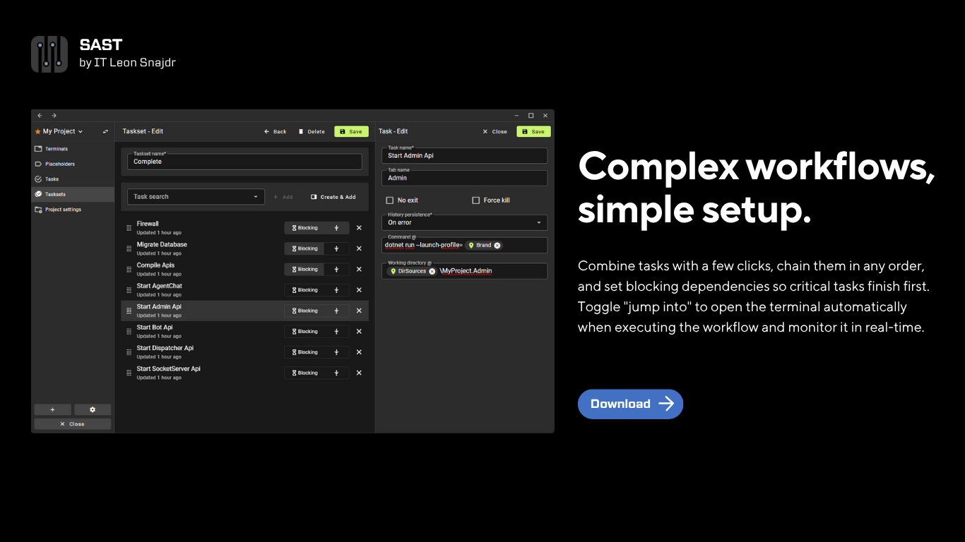 SAST est l’outil révolutionnaire pour automatiser l’exécution de vos scripts et commandes. Si vous êtes fatigué d’exécuter des commandes éparpillées une par une pour configurer un projet ou réaliser des tâches routinières, cet outil est la solution que vous attendiez. Grâce à SAST, finies les manipulations manuelles fastidieuses et les ajustements constants des chemins et paramètres. Gagnez en efficacité et en performance.