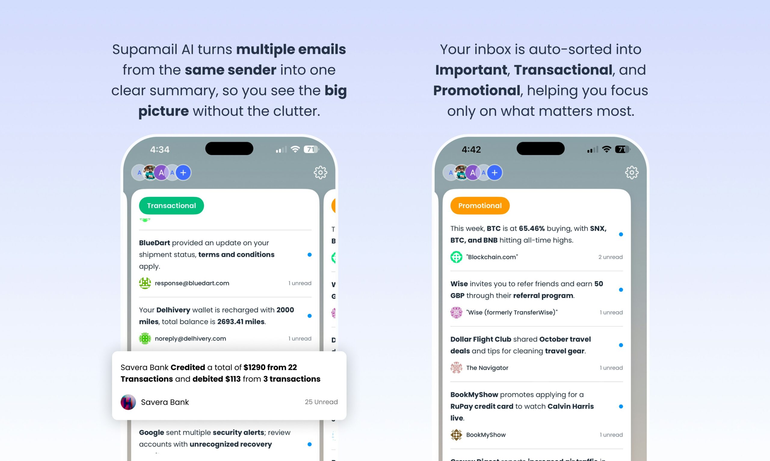 Supamail AI transforme le chaos de votre boîte de réception en clarté. L’outil résume les e-mails des dernières 24 heures en un format court et facile à lire pour que vous puissiez saisir l’essentiel en un coup d’œil. Il organise votre boîte de réception par expéditeur et catégorie, permet de désactiver les alertes non désirées et fournit des résumés quotidiens propres. La confidentialité est assurée, avec une certification CASA de niveau 2.