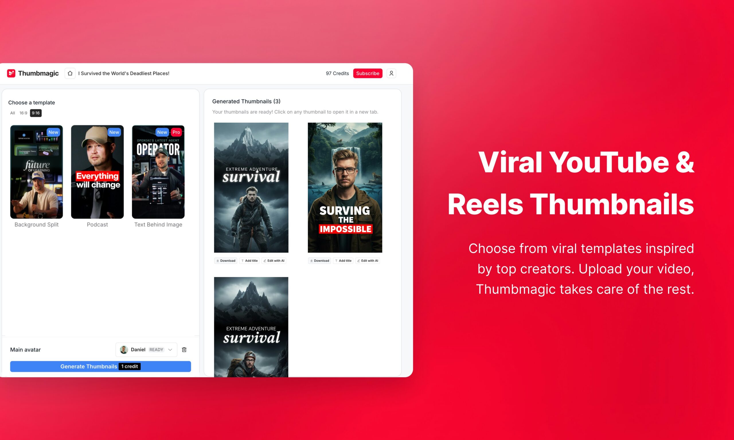 - Thumbmagic est un générateur de vignettes alimenté par l’IA pour YouTube et Reels, permettant aux créateurs de concevoir, personnaliser et éditer des vignettes attirantes destinées à augmenter les clics et les vues. Confié par des milliers de créateurs, cet outil met l’accent sur l’optimisation des visuels pour un impact maximal.