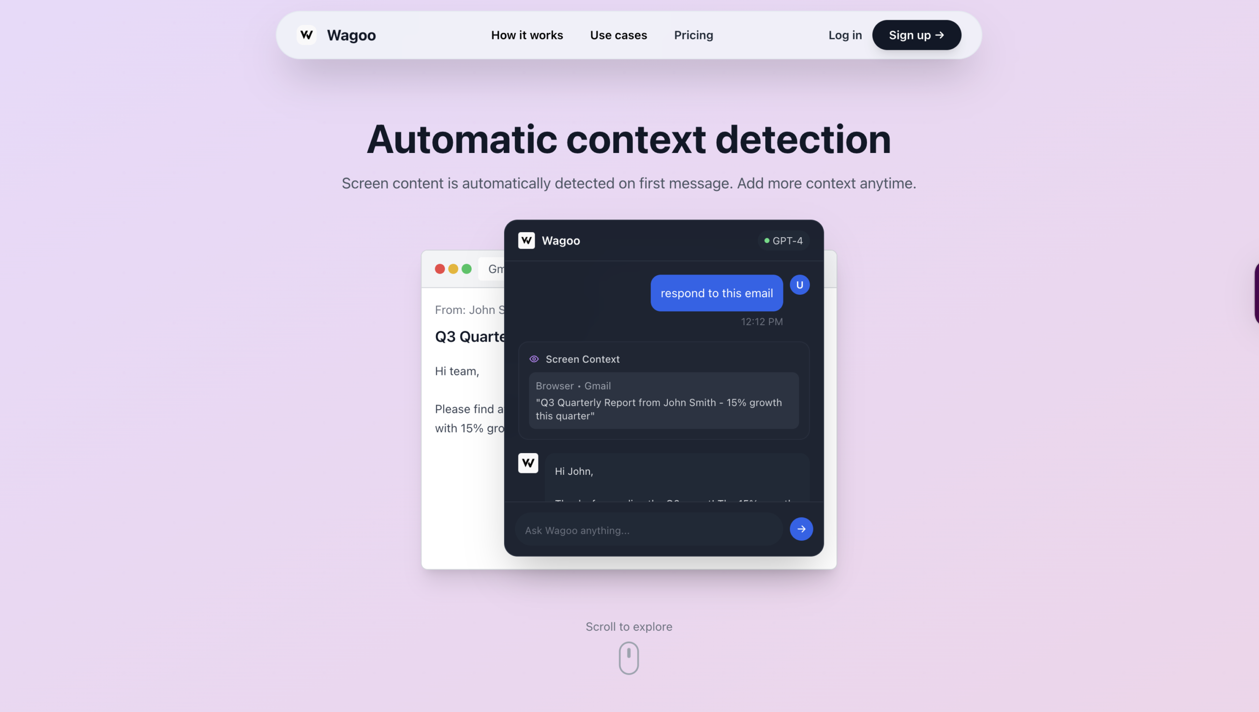 Wagoo est votre assistant personnel dédié, invisible et intelligent, conçu pour réduire la friction dans vos tâches au bureau. Avec des fonctionnalités telles que la détection contextuelle automatique de l’écran et la transcription vocale, il vous aide à répondre instantanément à vos requêtes grâce aux derniers modèles d’IA. Utilisez des modèles linguistiques locaux pour garantir la confidentialité de vos données tout en bénéficiant d’une assistance intelligente partout où vous en avez besoin.