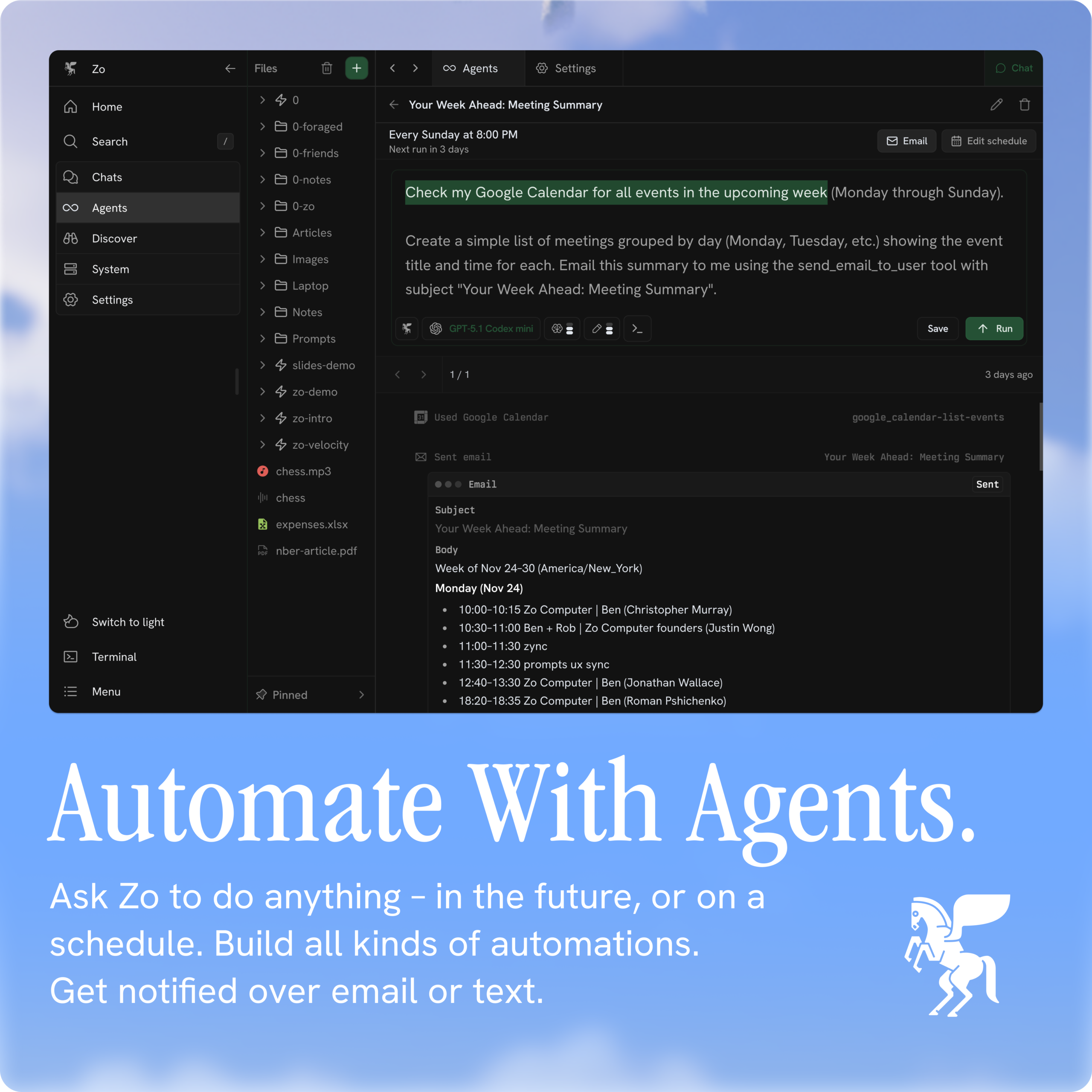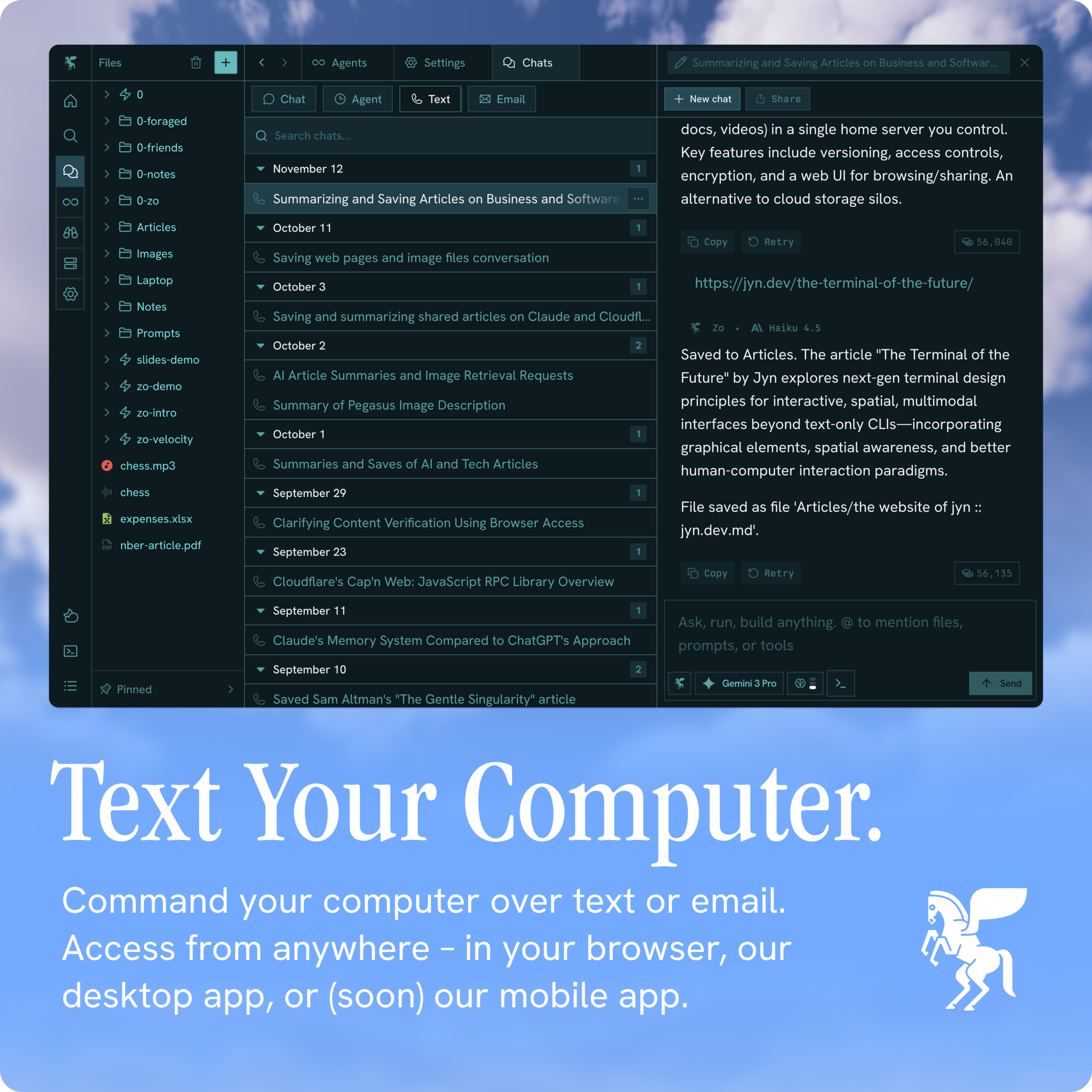 Zo Computer vous permet de créer des logiciels puissants et personnalisés sur un serveur intelligent. Stockez vos fichiers, connectez vos outils et utilisez l’intelligence artificielle pour effectuer des recherches ou des tâches dans un espace de travail unifié. Avec Zo Computer, vous possédez vos données et tout ce que vous créez, avec la possibilité de les télécharger à tout moment.